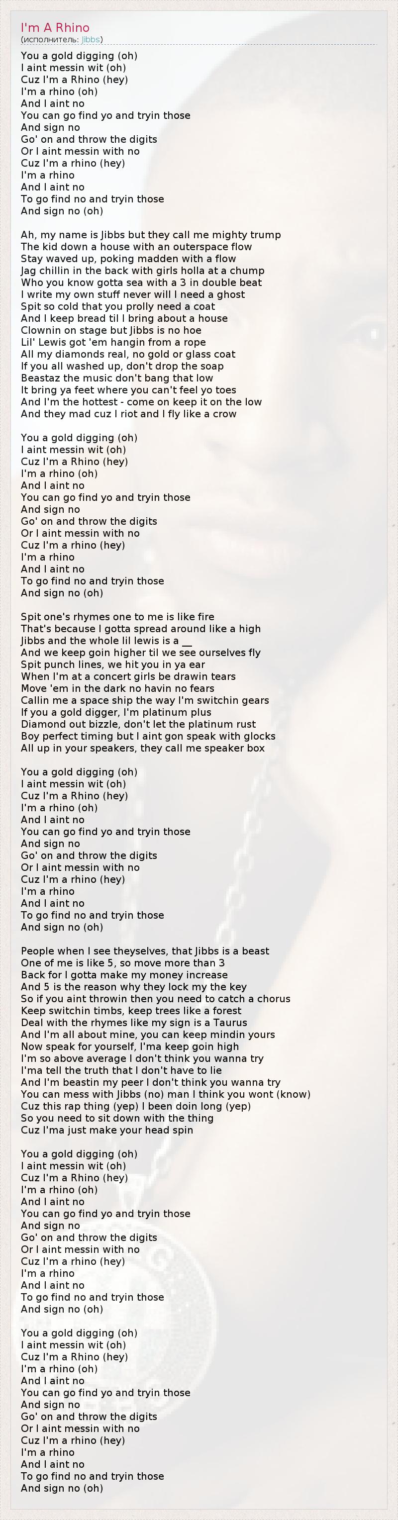 You a gold digging (oh) I aint messin wit (oh) Cuz I'm a Rhino (hey) I'm a rhino (oh) And I aint no You can go find yo and tryin those And sign no Go' on and throw the digits Or I aint messin with no Cuz I'm a rhino (hey) I'm a rhino And I aint no To go find no and tryin those And sign no (oh) Ah, my name is Jibbs but they call me mighty trump The kid down a house with an outerspace flow Stay waved up, poking madden with a flow Jag chillin in the back with girls holla at a chump Who you know gotta sea with a 3 in double beat I write my own stuff never will I need a ghost Spit so cold that you prolly need a coat And I keep bread til I bring about a house Clownin on stage but Jibbs is no hoe Lil' Lewis got 'em hangin from a rope All my diamonds real, no gold or glass coat If you all washed up, don't drop the soap Beastaz the music don't bang that low It bring ya feet where you can't feel yo toes And I'm the hottest - come on keep it on the low And they mad cuz I riot and I fly like a crow You a gold digging (oh) I aint messin wit (oh) Cuz I'm a Rhino (hey) I'm a rhino (oh) And I aint no You can go find yo and tryin those And sign no Go' on and throw the digits Or I aint messin with no Cuz I'm a rhino (hey) I'm a rhino And I aint no To go find no and tryin those And sign no (oh) Spit one's rhymes one to me is like fire That's because I gotta spread around like a high Jibbs and the whole lil lewis is a __ And we keep goin higher til we see ourselves fly Spit punch lines, we hit you in ya ear When I'm at a concert girls be drawin tears Move 'em in the dark no havin no fears Callin me a space ship the way I'm switchin gears If you a gold digger, I'm platinum plus Diamond out bizzle, don't let the platinum rust Boy perfect timing but I aint gon speak with glocks All up in your speakers, they call me speaker box You a gold digging (oh) I aint messin wit (oh) Cuz I'm a Rhino (hey) I'm a rhino (oh) And I aint no You can go find yo and tryin those And sign no Go' on and throw the digits Or I aint messin with no Cuz I'm a rhino (hey) I'm a rhino And I aint no To go find no and tryin those And sign no (oh) People when I see theyselves, that Jibbs is a beast One of me is like 5, so move more than 3 Back for I gotta make my money increase And 5 is the reason why they lock my the key So if you aint throwin then you need to catch a chorus Keep switchin timbs, keep trees like a forest Deal with the rhymes like my sign is a Taurus And I'm all about mine, you can keep mindin yours Now speak for yourself, I'ma keep goin high I'm so above average I don't think you wanna try I'ma tell the truth that I don't have to lie And I'm beastin my peer I don't think you wanna try You can mess with Jibbs (no) man I think you wont (know) Cuz this rap thing (yep) I been doin long (yep) So you need to sit down with the thing Cuz I'ma just make your head spin You a gold digging (oh) I aint messin wit (oh) Cuz I'm a Rhino (hey) I'm a rhino (oh) And I aint no You can go find yo and tryin those And sign no Go' on and throw the digits Or I aint messin with no Cuz I'm a rhino (hey) I'm a rhino And I aint no To go find no and tryin those And sign no (oh) You a gold digging (oh) I aint messin wit (oh) Cuz I'm a Rhino (hey) I'm a rhino (oh) And I aint no You can go find yo and tryin those And sign no Go' on and throw the digits Or I aint messin with no Cuz I'm a rhino (hey) I'm a rhino And I aint no To go find no and tryin those And sign no (oh)