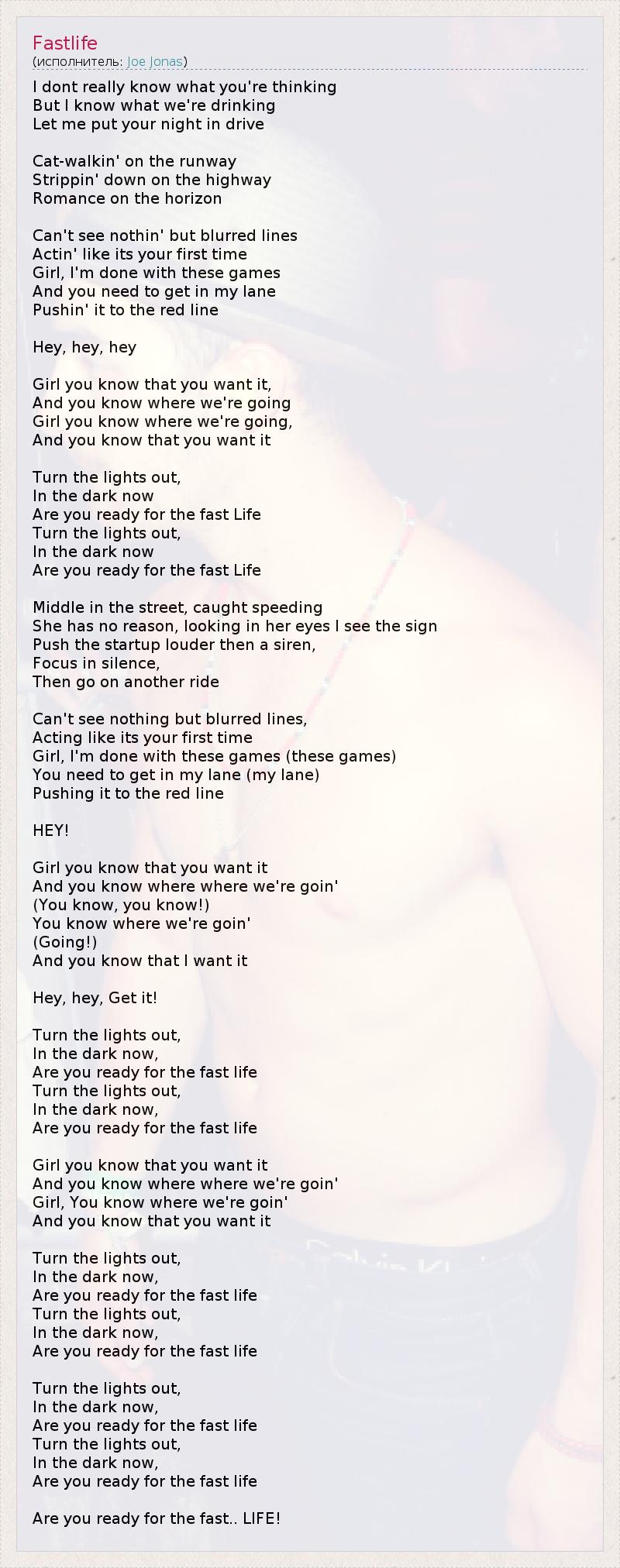 Феноменальный успех The Jonas Brothers стал для каждого из братьев Джонас прекрасным стартом в мире музыки. Fastlife - это сольная работа среднего из братьев, Джо, выдержанная в стиле танцевальной поп-музыки с элементами хип-хопа, техно и хауса - любимых музыкальных жанров Джонаса. Для записи альбома были приглашены такие известные продюсеры как Danja (работавший с Бритни Спирс, Мадонной и Пинк) и Роб Нокс (работавший с Рианной).