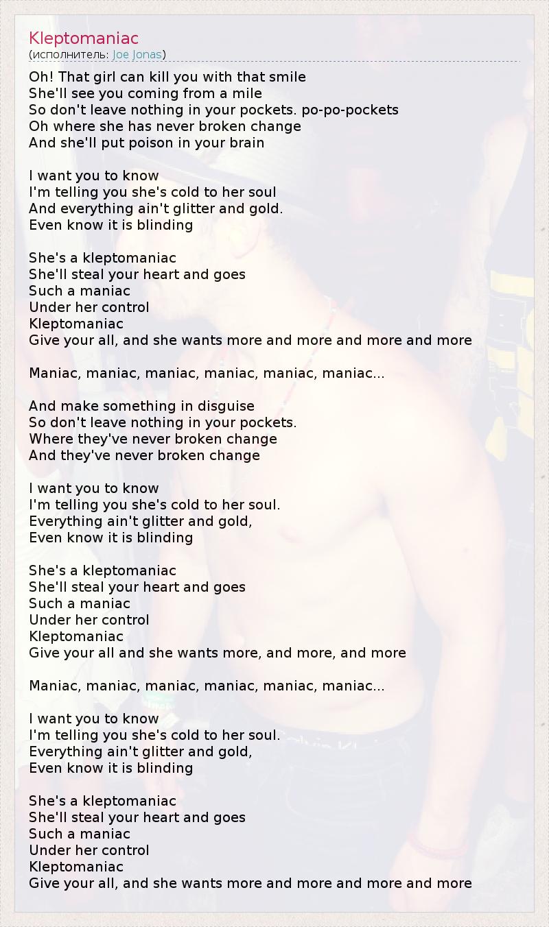 О! эта малышка может убить тебя одной улыбкой, Она увидит тебя за милю, поэтому Не оставляй ничего в своих карманах, ка-ка-рманах. О, в которые она никогда не лазила. Она запудрит тебе мозги! Я хочу предупредить тебя, Говорю тебе, у неё холодная душа, И все это не блеск и золото, Пусть даже оно ослепляет. Она — клептоманка, Она украдет твое сердце, Она ведет себя, как настоящий маньяк. Под её контролем, Клептоманка, Отдаешь ей все, и она хочет все больше, больше, больше и больше. Маньяк, маньяк, маньяк, маньяк, маньяк, маньяк... И замаскируйся, Поэтому не оставляй ничего в своих карманах, В которые они никогда не лазили, Они никогда не лазили. Я хочу предупредить тебя, Говорю тебе, у неё холодная душа, И все это не блеск и золото, Пусть даже оно ослепляет. Она — клептоманка, Она украдет твое сердце, Она ведет себя, как настоящий маньяк. Под её контролем, Клептоманка, Отдаешь ей все, и она хочет все больше, больше, больше и больше. Маньяк, маньяк, маньяк, маньяк, маньяк, маньяк... Я хочу предупредить тебя, Говорю тебе, у неё холодная душа, И все это не блеск и золото, Даже зная, что он ослепляет. Она — клептоманка, Она украдет твое сердце, Она ведет себя, как настоящий маньяк. Под её контролем, Клептоманка, Отдаешь ей все, и она хочет все больше, больше, больше и больше.