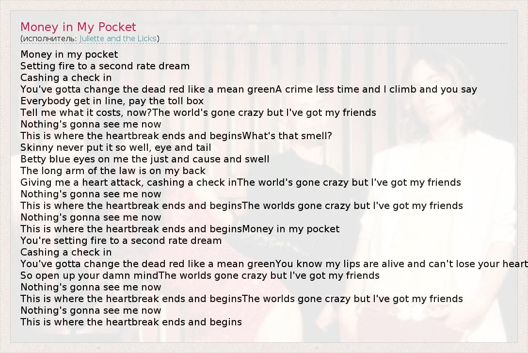 А как ты думаешь, о чем песня "Money in My Pocket" ?