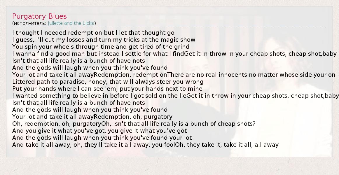 А как ты думаешь, о чем песня "Purgatory Blues" ?