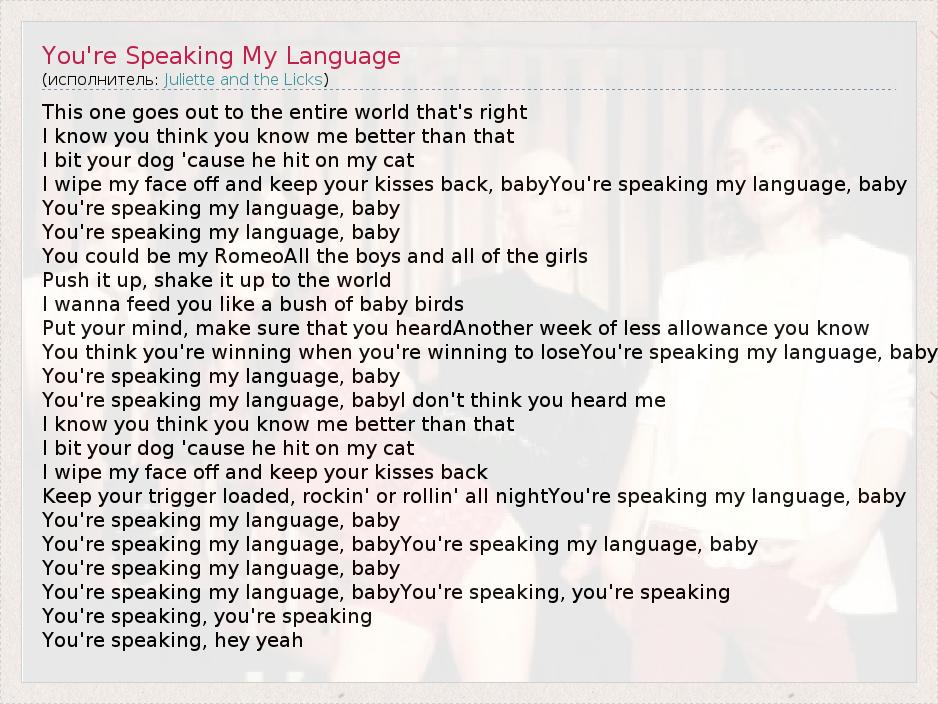 This one goes out to the entire world that's right I know you think you know me better than that I bit your dog 'cause he hit on my cat I wipe my face off and keep your kisses back, babyYou're speaking my language, baby You're speaking my language, baby You're speaking my language, baby You could be my RomeoAll the boys and all of the girls Push it up, shake it up to the world I wanna feed you like a bush of baby birds Put your mind, make sure that you heardAnother week of less allowance you know You think you're winning when you're winning to loseYou're speaking my language, baby You're speaking my language, baby You're speaking my language, babyI don't think you heard me I know you think you know me better than that I bit your dog 'cause he hit on my cat I wipe my face off and keep your kisses back Keep your trigger loaded, rockin' or rollin' all nightYou're speaking my language, baby You're speaking my language, baby You're speaking my language, babyYou're speaking my language, baby You're speaking my language, baby You're speaking my language, babyYou're speaking, you're speaking You're speaking, you're speaking You're speaking, hey yeah