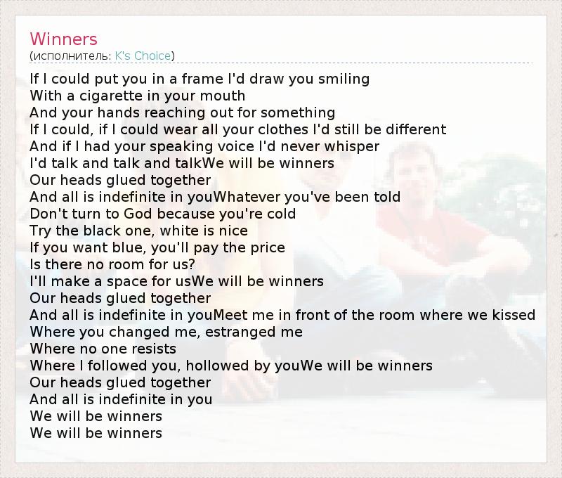 Это интересно:K’s Choice - бельгийская рок-группа из Антверпена. Их стиль можно охарактеризовать как гитарный рок, или фолк-рок.Состав:Сара Беттенс - вокал, гитара.Герт Беттенс - гитара, клавишные, вокал.Эрик Гроссман - бас-гитара.Ян ван Сихем младший - гитара.Коен Лиекенс - ударные.В настоящий момент участники группы работают над сольным проектами. Сара Беттенс выпустила альбом под... продолжение