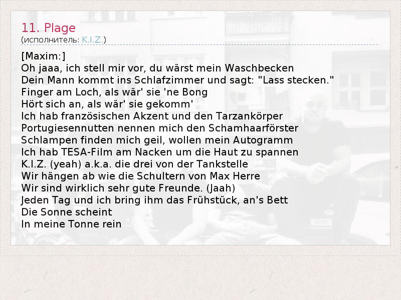 Это интересно:K.I.Z. это немецкая хип-хоп команда из Берлина. K.I.Z., по их собственному мнению, создали новый стиль немецкой рэп музыки, называя его "смесью панка и техно". Это прежде всего рэп батлы, как правило, заполненые большим количеством иронии и черного юмора. Группа состоит из четырех человек: Тарек, Максим, Нико (так известный как € 8000) и DJ Craft.Имеется несколько версий рассшифровки аббревиатуры... продолжение