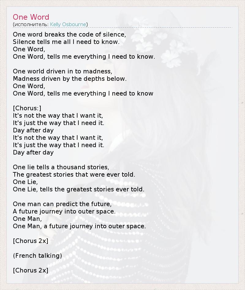 Одно слово способно уничтожить кодекс тишины. Тишина говорит мне обо всём, что мне нужно знать. Одно слово, Одно слово – и я знаю всё, что мне нужно знать. Один мир, доведённый до безумия, Безумия, рождённого в неизведанных глубинах. Одно слово, Одно слово – и я знаю всё, что мне нужно знать. (Припев) Я не хочу, чтобы всё было так, Просто мне нужно, чтобы всё было так День за днём. Я не хочу, чтобы всё было так, Просто мне нужно, чтобы всё было так День за днём. Одна ложь способна породить тысячи историй, Лучшие из тех, что когда-либо были рассказаны. Одна ложь, Одна ложь способна породить тысячи историй. Один человек может предсказать будущее, Будущее путешествие в открытый космос. Один Человек, Один Человек, будущее путешествие в открытый космос. (Припев: 2 раза) (Французская речь) (Припев: 2 раза)