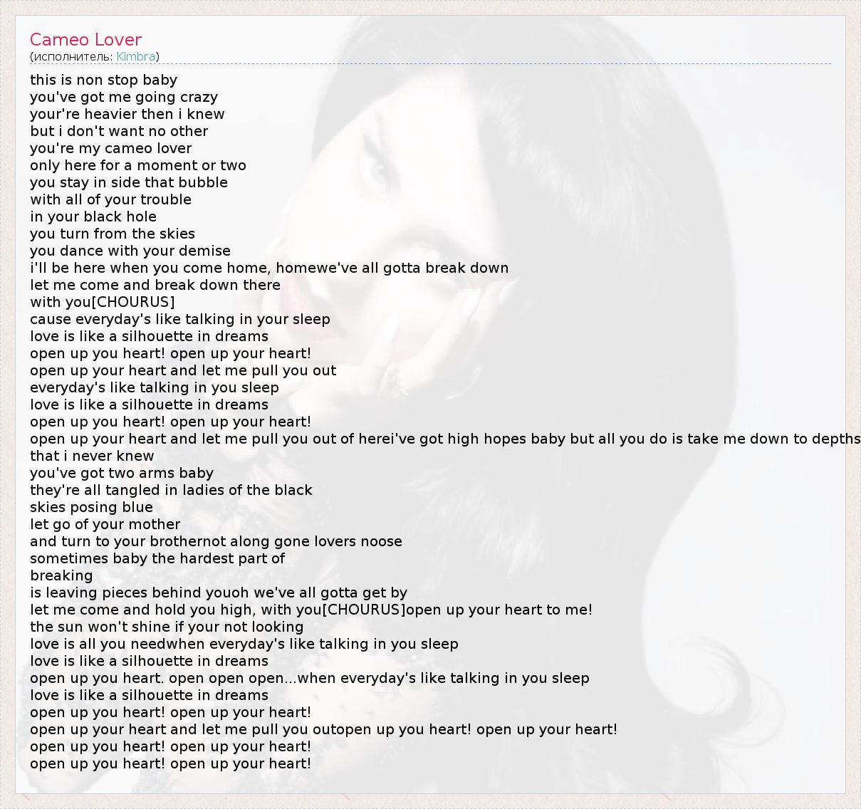this is non stop baby you've got me going crazy your're heavier then i knew but i don't want no other you're my cameo lover only here for a moment or two you stay in side that bubble with all of your trouble in your black hole you turn from the skies you dance with your demise i'll be here when you come home, homewe've all gotta break down let me come and break down there with you[CHOURUS] cause everyday's like talking in your sleep love is like a silhouette in dreams open up you heart! open up your heart! open up your heart and let me pull you out everyday's like talking in you sleep love is like a silhouette in dreams open up you heart! open up your heart! open up your heart and let me pull you out of herei've got high hopes baby but all you do is take me down to depths that i never knew you've got two arms baby they're all tangled in ladies of the black skies posing blue let go of your mother and turn to your brothernot along gone lovers noose sometimes baby the hardest part of breaking is leaving pieces behind youoh we've all gotta get by let me come and hold you high, with you[CHOURUS]open up your heart to me! the sun won't shine if your not looking love is all you needwhen everyday's like talking in you sleep love is like a silhouette in dreams open up you heart. open open open...when everyday's like talking in you sleep love is like a silhouette in dreams open up you heart! open up your heart! open up your heart and let me pull you outopen up you heart! open up your heart! open up you heart! open up your heart! open up you heart! open up your heart!