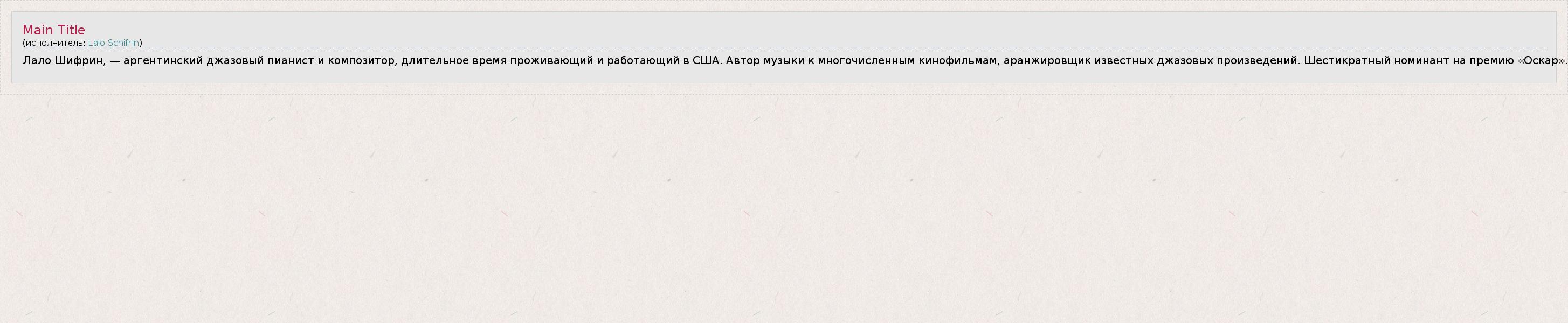 Лало Шифрин, — аргентинский джазовый пианист и композитор, длительное время проживающий и работающий в США. Автор музыки к многочисленным кинофильмам, аранжировщик известных джазовых произведений. Шестикратный номинант на премию «Оскар».