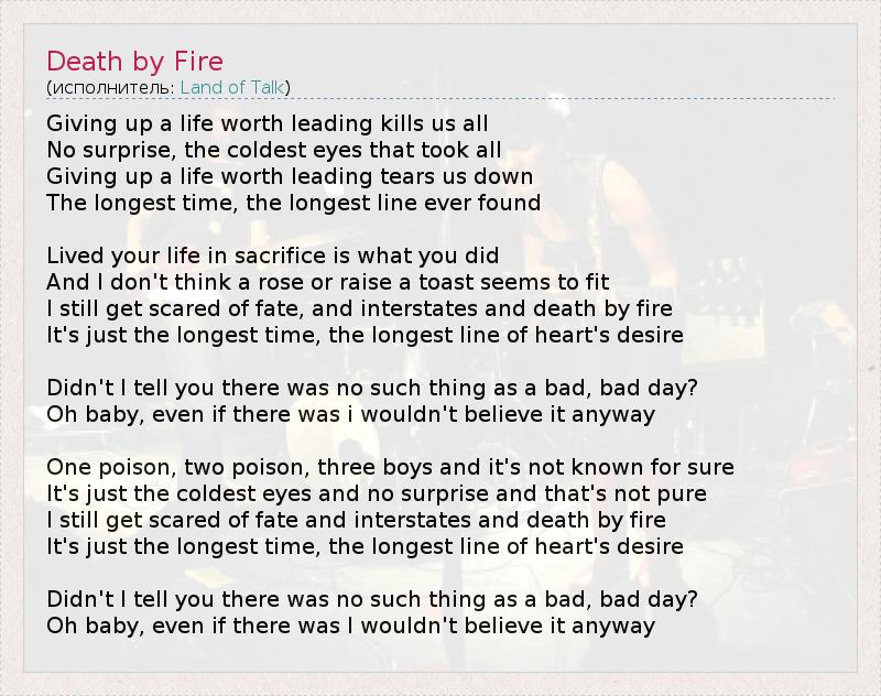 Giving up a life worth leading kills us all No surprise, the coldest eyes that took all Giving up a life worth leading tears us down The longest time, the longest line ever found Lived your life in sacrifice is what you did And I don't think a rose or raise a toast seems to fit I still get scared of fate, and interstates and death by fire It's just the longest time, the longest line of heart's desire Didn't I tell you there was no such thing as a bad, bad day? Oh baby, even if there was i wouldn't believe it anyway One poison, two poison, three boys and it's not known for sure It's just the coldest eyes and no surprise and that's not pure I still get scared of fate and interstates and death by fire It's just the longest time, the longest line of heart's desire Didn't I tell you there was no such thing as a bad, bad day? Oh baby, even if there was I wouldn't believe it anyway