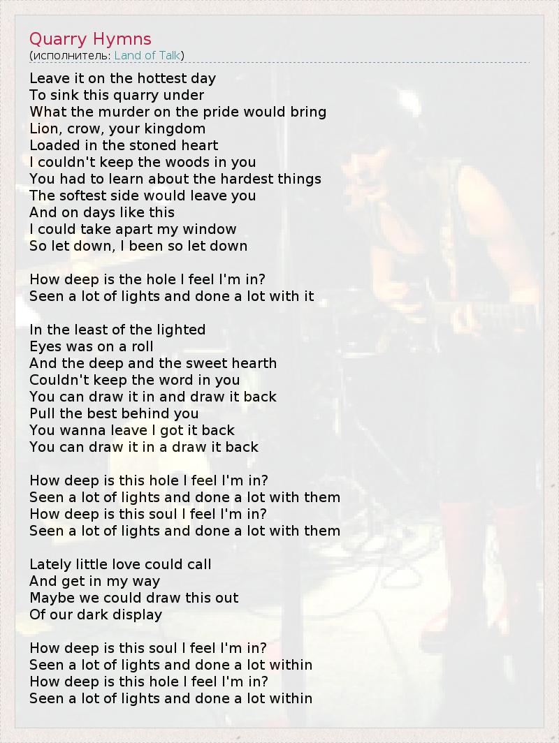 Leave it on the hottest day To sink this quarry under What the murder on the pride would bring Lion, crow, your kingdom Loaded in the stoned heart I couldn't keep the woods in you You had to learn about the hardest things The softest side would leave you And on days like this I could take apart my window So let down, I been so let down How deep is the hole I feel I'm in? Seen a lot of lights and done a lot with it In the least of the lighted Eyes was on a roll And the deep and the sweet hearth Couldn't keep the word in you You can draw it in and draw it back Pull the best behind you You wanna leave I got it back You can draw it in a draw it back How deep is this hole I feel I'm in? Seen a lot of lights and done a lot with them How deep is this soul I feel I'm in? Seen a lot of lights and done a lot with them Lately little love could call And get in my way Maybe we could draw this out Of our dark display How deep is this soul I feel I'm in? Seen a lot of lights and done a lot within How deep is this hole I feel I'm in? Seen a lot of lights and done a lot within