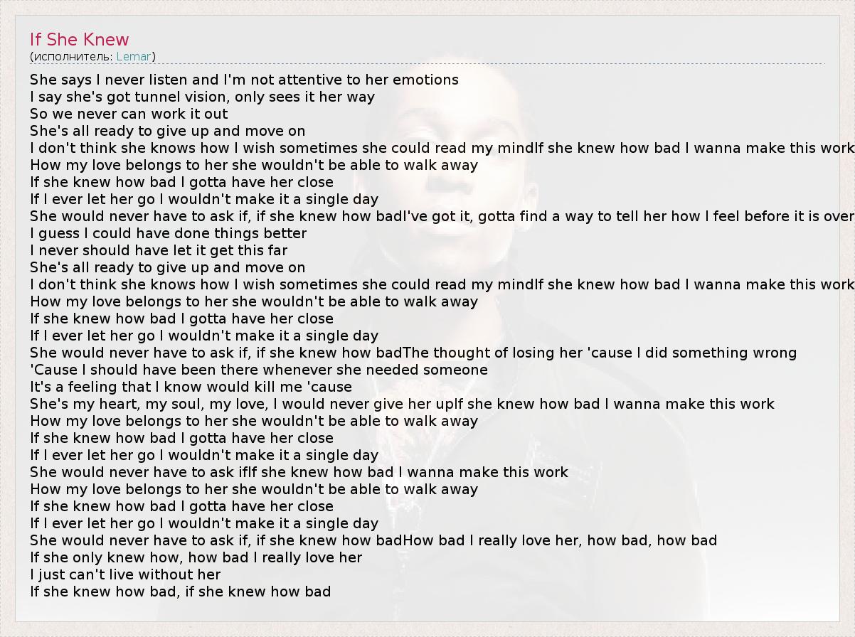 She would never have to ask if, if she knew how badHow bad I really love her, how bad, how bad