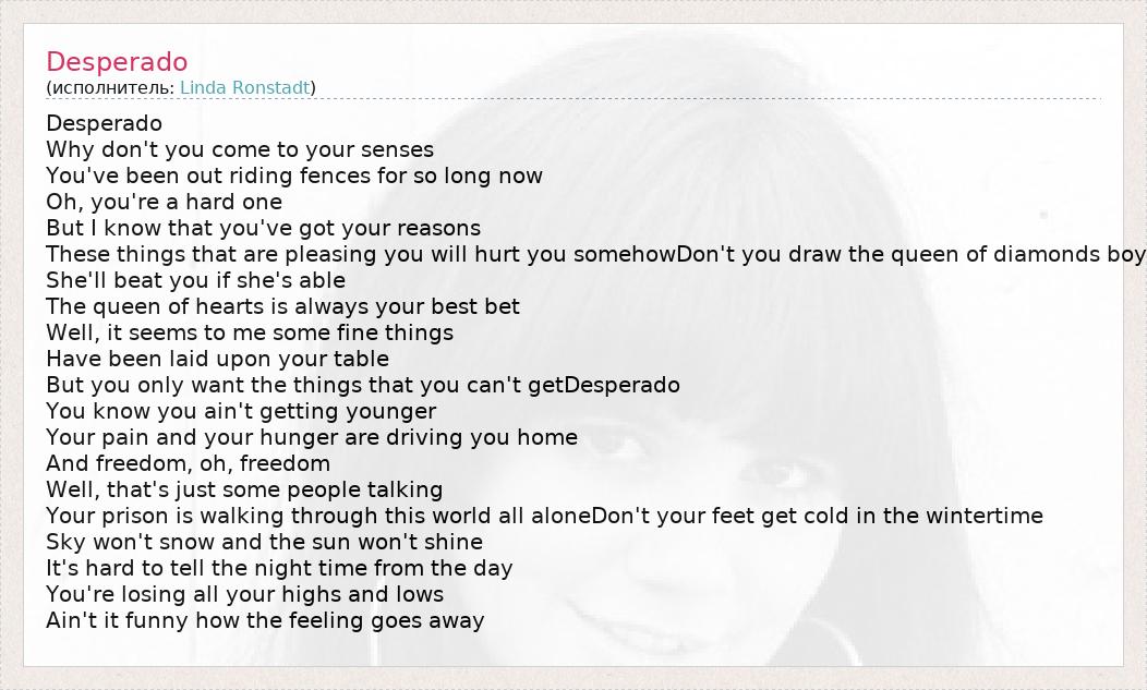 Desperado Why don't you come to your senses You've been out riding fences for so long now Oh, you're a hard one But I know that you've got your reasons These things that are pleasing you will hurt you somehowDon't you draw the queen of diamonds boy She'll beat you if she's able The queen of hearts is always your best bet Well, it seems to me some fine things Have been laid upon your table But you only want the things that you can't getDesperado You know you ain't getting younger Your pain and your hunger are driving you home And freedom, oh, freedom Well, that's just some people talking Your prison is walking through this world all aloneDon't your feet get cold in the wintertime Sky won't snow and the sun won't shine It's hard to tell the night time from the day You're losing all your highs and lows Ain't it funny how the feeling goes away