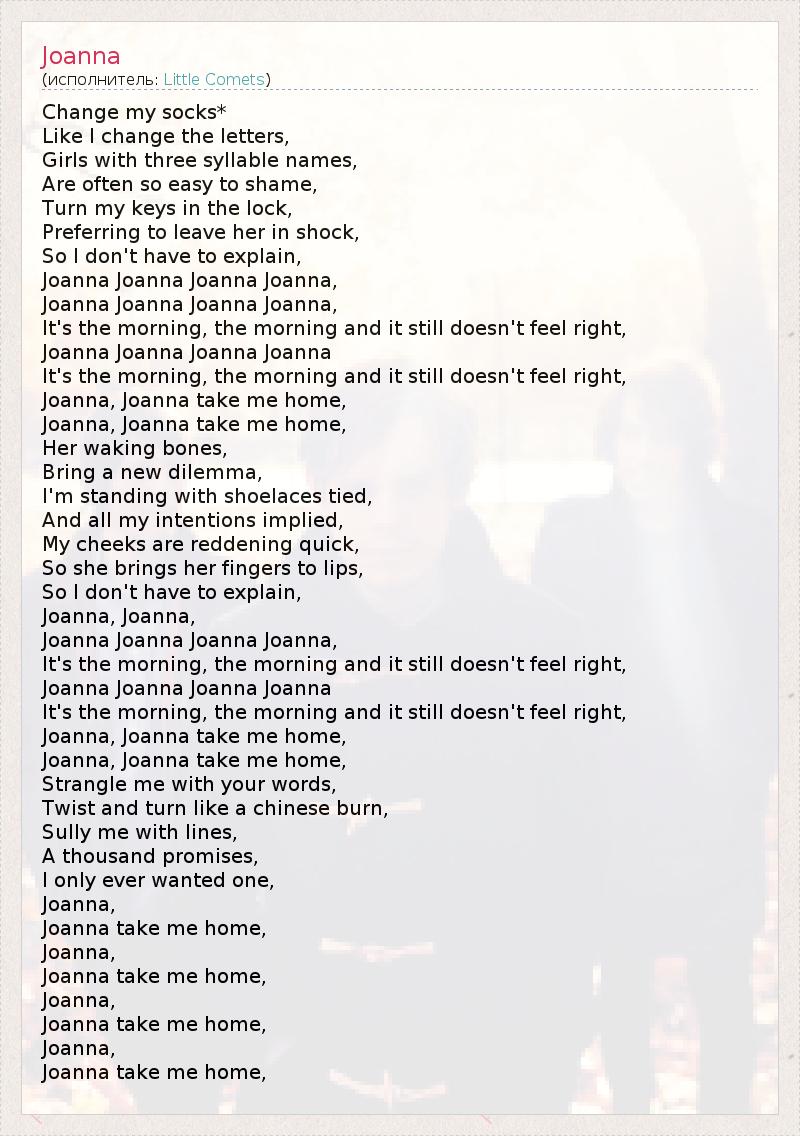 Change my socks* Like I change the letters, Girls with three syllable names, Are often so easy to shame, Turn my keys in the lock, Preferring to leave her in shock, So I don't have to explain, Joanna Joanna Joanna Joanna, Joanna Joanna Joanna Joanna, It's the morning, the morning and it still doesn't feel right, Joanna Joanna Joanna Joanna It's the morning, the morning and it still doesn't feel right, Joanna, Joanna take me home, Joanna, Joanna take me home, Her waking bones, Bring a new dilemma, I'm standing with shoelaces tied, And all my intentions implied, My cheeks are reddening quick, So she brings her fingers to lips, So I don't have to explain, Joanna, Joanna, Joanna Joanna Joanna Joanna, It's the morning, the morning and it still doesn't feel right, Joanna Joanna Joanna Joanna It's the morning, the morning and it still doesn't feel right, Joanna, Joanna take me home, Joanna, Joanna take me home, Strangle me with your words, Twist and turn like a chinese burn, Sully me with lines, A thousand promises, I only ever wanted one, Joanna, Joanna take me home, Joanna, Joanna take me home, Joanna, Joanna take me home, Joanna, Joanna take me home,
