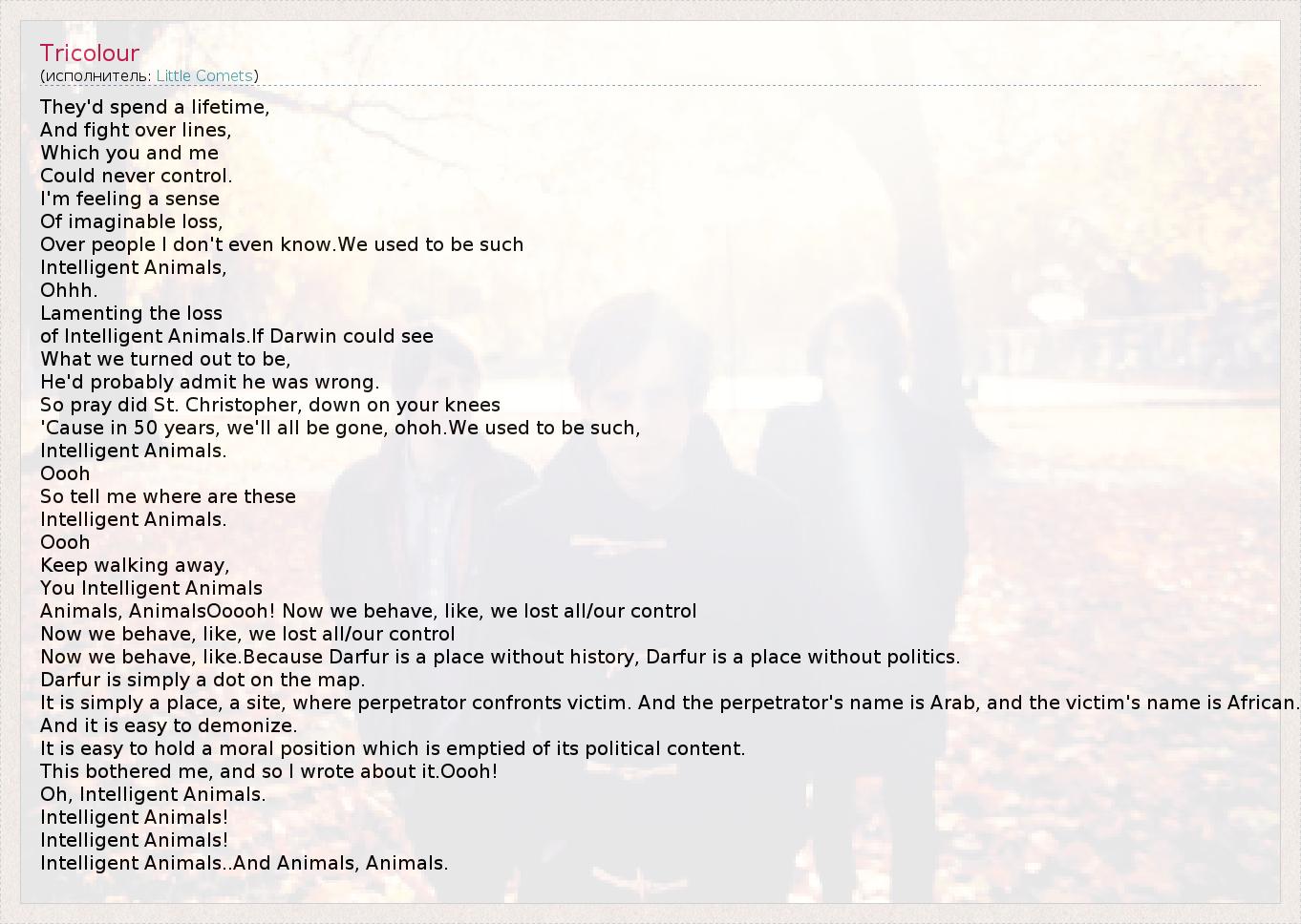 Это интересно:Little Comets are an indie rock-quartet from Sunderland and Newcastle-upon-Tyne. They are described to play 'kitchen sink indie' music, citing Debussy, Roald Dahl, Ella Fitzgerald and Paul Simon as influences. In early 2009 the band were signed to Columbia Records and are due to release their debut album In Search of Elusive Little Comets on 31 January 2011.On 9 February 2009, the band released their debut single, "One Night in October" as both a digital download and a vinyl. The single received praise from BBC Radio 1 DJs Huw Stephens, Zane Lowe and Sara Cox, all of whom played the song on their respective shows. The single debuted at number 3 on the independent chart,... продолжение