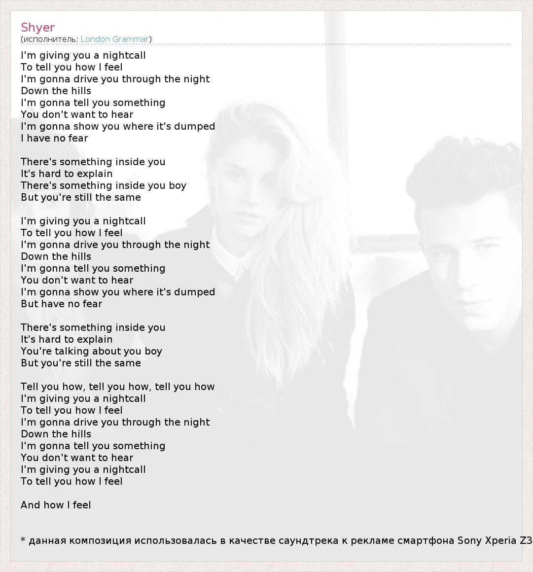Это интересно:London Grammar — британский музыкальный коллектив, образованный в 2009 году в Лондоне. В состав входят вокалистка Ханна Рид (Hannah Reid), гитарист Дэн Ротман (Dan Rothman) и мультиинструменталист Дот Мейджор (Dot Major).Ханна Рид и Дэн Ротман познакомились в 2009 году, будучи студентами Ноттингемского университета, и вместе начали музицировать; позднее к ним присоединился Дот Мейджор.... продолжение
