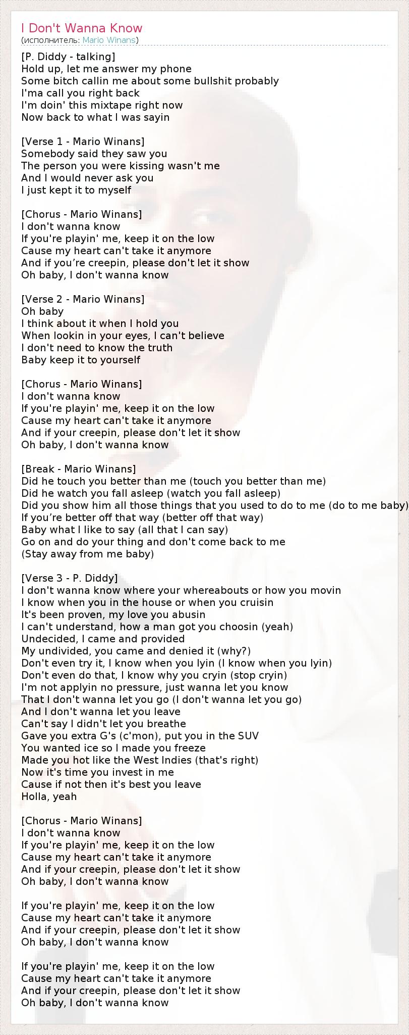 [P. Diddy - talking] Hold up, let me answer my phone Some bitch callin me about some bullshit probably I'ma call you right back I'm doin' this mixtape right now Now back to what I was sayin [Verse 1 - Mario Winans] Somebody said they saw you The person you were kissing wasn't me And I would never ask you I just kept it to myself [Chorus - Mario Winans] I don't wanna know If you're playin' me, keep it on the low Cause my heart can't take it anymore And if you’re creepin, please don't let it show Oh baby, I don't wanna know [Verse 2 - Mario Winans] Oh baby I think about it when I hold you When lookin in your eyes, I can't believe I don't need to know the truth Baby keep it to yourself [Chorus - Mario Winans] I don't wanna know If you're playin' me, keep it on the low Cause my heart can't take it anymore And if your creepin, please don't let it show Oh baby, I don't wanna know [Break - Mario Winans] Did he touch you better than me (touch you better than me) Did he watch you fall asleep (watch you fall asleep) Did you show him all those things that you used to do to me (do to me baby) If you’re better off that way (better off that way) Baby what I like to say (all that I can say) Go on and do your thing and don't come back to me (Stay away from me baby) [Verse 3 - P. Diddy] I don't wanna know where your whereabouts or how you movin I know when you in the house or when you cruisin It's been proven, my love you abusin I can't understand, how a man got you choosin (yeah) Undecided, I came and provided My undivided, you came and denied it (why?) Don't even try it, I know when you lyin (I know when you lyin) Don't even do that, I know why you cryin (stop cryin) I'm not applyin no pressure, just wanna let you know That I don't wanna let you go (I don't wanna let you go) And I don't wanna let you leave Can't say I didn't let you breathe Gave you extra G's (c'mon), put you in the SUV You wanted ice so I made you freeze Made you hot like the West Indies (that's right) Now it's time you invest in me Cause if not then it's best you leave Holla, yeah [Chorus - Mario Winans] I don't wanna know If you're playin' me, keep it on the low Cause my heart can't take it anymore And if your creepin, please don't let it show Oh baby, I don't wanna know If you're playin' me, keep it on the low Cause my heart can't take it anymore And if your creepin, please don't let it show Oh baby, I don't wanna know If you're playin' me, keep it on the low Cause my heart can't take it anymore And if your creepin, please don't let it show Oh baby, I don't wanna know