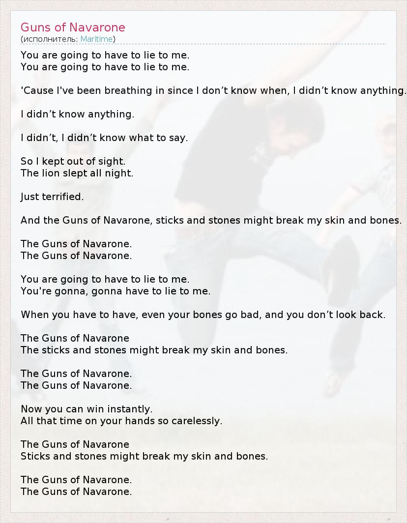 You are going to have to lie to me. You are going to have to lie to me. 'Cause I've been breathing in since I don’t know when, I didn’t know anything. I didn’t know anything. I didn’t, I didn’t know what to say. So I kept out of sight. The lion slept all night. Just terrified. And the Guns of Navarone, sticks and stones might break my skin and bones. The Guns of Navarone. The Guns of Navarone. You are going to have to lie to me. You're gonna, gonna have to lie to me. When you have to have, even your bones go bad, and you don’t look back. The Guns of Navarone The sticks and stones might break my skin and bones. The Guns of Navarone. The Guns of Navarone. Now you can win instantly. All that time on your hands so carelessly. The Guns of Navarone Sticks and stones might break my skin and bones. The Guns of Navarone. The Guns of Navarone.