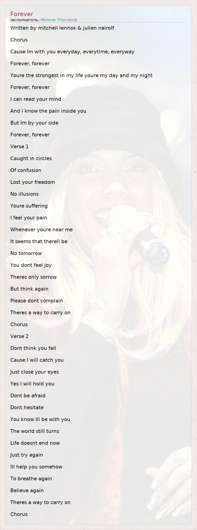 Written by mitchell lennox & julien nairolf Chorus Cause Im with you everyday, everytime, everyway Forever, forever Youre the strongest in my life youre my day and my night Forever, forever I can read your mind And I know the pain inside you But Im by your side Forever, forever Verse 1 Caught in circles Of confusion Lost your freedom No illusions Youre suffering I feel your pain Whenever youre near me It seems that therell be No tomorrow You dont feel joy Theres only sorrow But think again Please dont complain Theres a way to carry on Chorus Verse 2 Dont think you fall Cause I will catch you Just close your eyes Yes I will hold you Dont be afraid Dont hesitate You know Ill be with you The world still turns Life doesnt end now Just try again Ill help you somehow To breathe again Believe again Theres a way to carry on Chorus