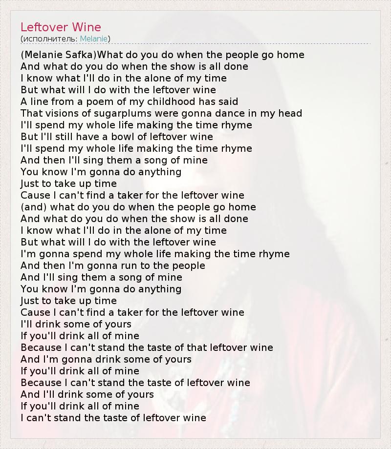 (Melanie Safka)What do you do when the people go home And what do you do when the show is all done I know what I'll do in the alone of my time But what will I do with the leftover wine A line from a poem of my childhood has said That visions of sugarplums were gonna dance in my head I'll spend my whole life making the time rhyme But I'll still have a bowl of leftover wine I'll spend my whole life making the time rhyme And then I'll sing them a song of mine You know I'm gonna do anything Just to take up time Cause I can't find a taker for the leftover wine (and) what do you do when the people go home And what do you do when the show is all done I know what I'll do in the alone of my time But what will I do with the leftover wine I'm gonna spend my whole life making the time rhyme And then I'm gonna run to the people And I'll sing them a song of mine You know I'm gonna do anything Just to take up time Cause I can't find a taker for the leftover wine I'll drink some of yours If you'll drink all of mine Because I can't stand the taste of that leftover wine And I'm gonna drink some of yours If you'll drink all of mine Because I can't stand the taste of leftover wine And I'll drink some of yours If you'll drink all of mine I can't stand the taste of leftover wine