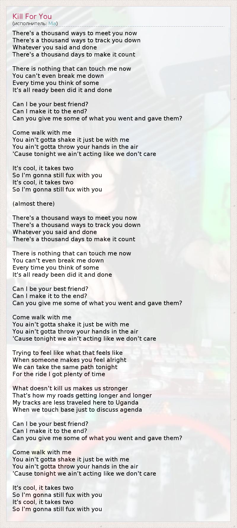 А как ты думаешь, о чем песня "Kill For You" ?