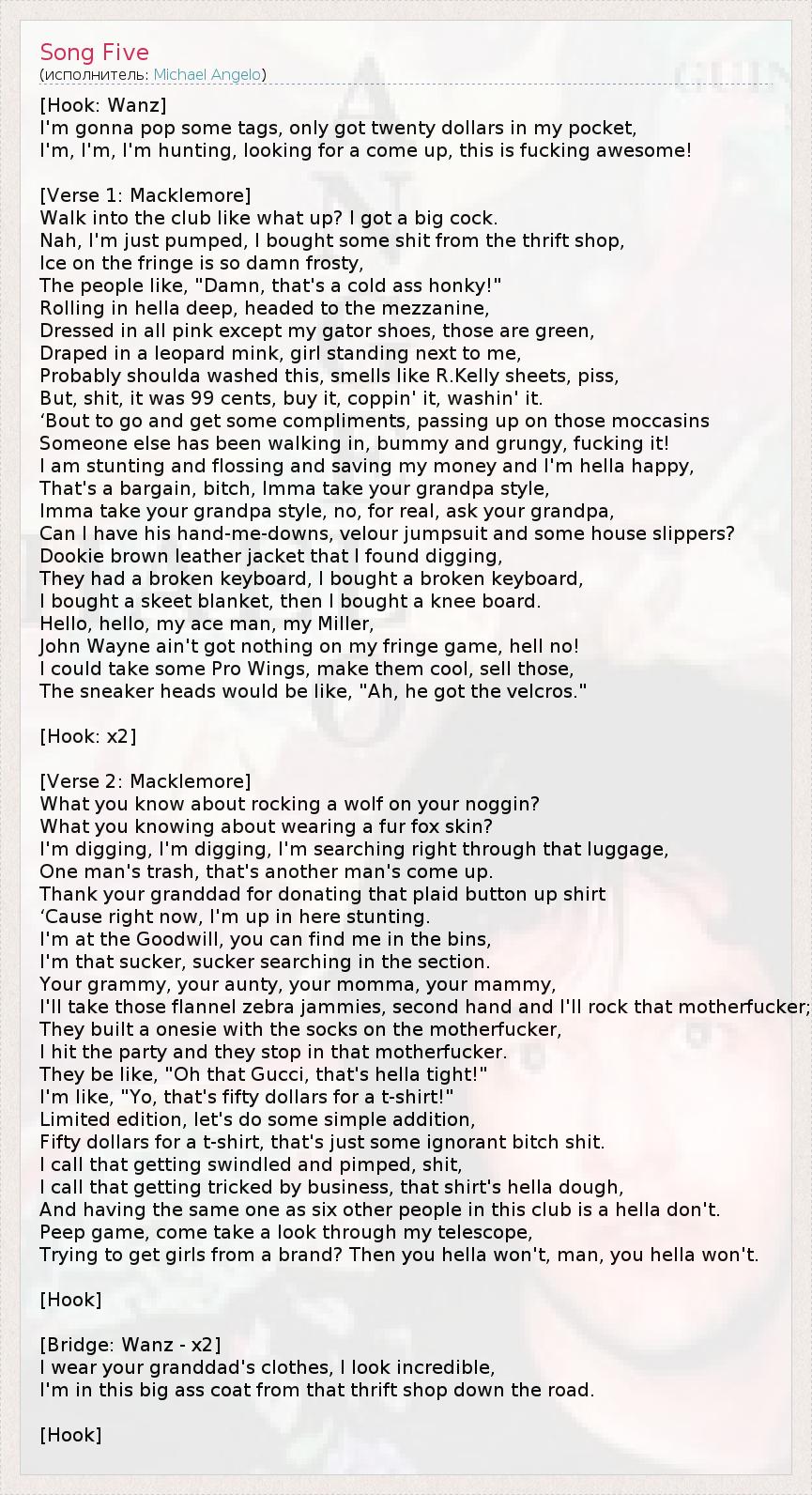 [Хук: Wanz] Я тут собираюсь маленько приодеться, но в кармане только двадцать долларов, И я, я, я, будто старатель, выискивающий золото, это просто о**ительно! [Куплет 1: Macklemore] Захожу в клуб, чего тут новенького? У меня большой х**н. Да не, это я шутканул, я просто прибарахлился в комиссионке, Камушки по краям, это вообщё ништяк, Народ такой: "Блин, реально чёткий белый пацан!" Я пробираюсь сквозь толпу, иду в бельэтаж, Одетый во всё розовое, кроме ботинок из крокодила – они зелёные, Рядом со мной стоит девчонка, на мне шуба леопардового меха, Наверное, надо было постирать её, а то от неё несёт сс**ами, как от простыней Ар Келли, 1 Да, на х**, зато всего 99 центов: выбрал, оплатил, состирнул. Ещё скажите спасибо, что не купил мокасины: В них до меня уже кто-то ходил, поэтому они загаженные и вонючие, ну их на х**! Я модный и стильный, ещё и денег сэкономил, так что радости полные штаны, Это удачное вложение денег, с**а; я позаимствую стиль у твоего дедули, Я позаимствую стиль у твоего дедули, не, серьёзно, там порасспрашивай его: Отдаст он мне свои старые тряпки, велюровый комбез и какие-нибудь тапки? Ещё я откопал какашечно-коричневый кожаный куртец, Там у них был сломанный синтезатор, ну, я и его купил, Взял простынку для д**чки, потом ещё ниборд. 2 Мои приветы крутому парняге Миллеру, Бахрома Джона Уэйна с моей даже рядом не свисала! 3 Я могу купить дешёвые шузы, раскрутить их и продать подороже, И все фаны кроссовок обалдеют: "Ух ты, они у него на липучках!" [Хук: x2] [Куплет 2: Macklemore] Что ты можешь понимать в ношении шкуры волка на голове? Что ты знаешь об облачении в лисий мех? Я ищу, я роюсь, я ворошу все эти кипы, Что для одного мусор, для другого – сокровище. Спасибо твоему дедушке за клетчатую рубашку на пуговках, Я теперь буду рассекать в ней. Сейчас я в "Гудвилле", 4 роюсь в кучах тряпья, Можешь звать меня лохом, но лохом, который прошуршал весь отдел. У твоих бабуси, тетушки, мамочки и няньки Я возьму фланелевые пижамы с узором зебры, пускай это секонд-хэнд, зато обос**ться, как модно, К тому же, они образуют комплект с носками, Я жгу на вечеринке в этом о**енительном наряде и, вдруг все останавливаются, И такие: "Ух ты, Гуччи, вообще шикарно!" А я: "Да вы чё? Пятьдесят баксов за футболку!" Типа ограниченная серия; давайте проведём несложные вычисления: Платить пятьдесят долларов за футболку – это пи**ец, как тупо. Это грабёж и надувательство, Вас просто обведут вокруг пальца, за такую-то цену, Да в придачу ещё шесть чуваков в клубе точно в таких же, это ни фига не круто. Давай играть в гляделки, посмотри в мой телескоп, Пытаешься склеить девок модными брендами? Ни фига не выйдет, чел, ни фига не выйдет. [Хук] [Переход: Wanz - x2] Я одет, как твой дед и выгляжу потрясно, Я в здоровенном пиджаке из комиссионки, что вниз по улице. [Хук] * – Thrift shop – розничный магазин, управляемый благотворительной организацией или группой активистов с целью привлечения средств на конкретную цель, однако, жителям СНГ более близко понятие "комиссионного магазина", поэтому я считаю возможной замену транслатемы. 1 – В феврале 2002 года было опубликовано порнографическое видео с урофилическим уклоном с участием r'n'b-певца R.Kelly и несовершеннолетней девушки. 2 – Особая, короткая и широкая, доска для сёрфинга; на ней катаются, стоя на коленях. 3 – Джон Уэйн – американский киноактёр, звезда вестернов. Непременным атрибутом ковбоя с