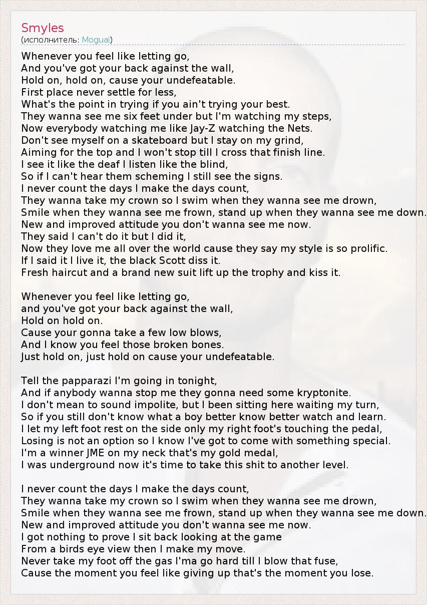 Всякий раз, когда ты чувствуешь, будто все валится из рук И ты оказываешься припертым к стенке, Держись, держись, потому что ты непобедимый. Держи первенство, не довольствуйся меньшим. Какой смысл в стараниях, когда не прилагаешь всех усилий. Они хотят видеть меня мертвым, но я соблюдаю осторожность. Теперь все наблюдают за мной подобно тому, как Джей-Зи 1 смотрит баскетбол. Не вижу себя на скейтборде, но зарабатываю хорошие деньги, Стремлюсь к вершине и не остановлюсь, пока не пересеку финишную черту. Я вижу это, как глухой, я слышу это, как слепой. Так что если я не могу слышать то, что они замышляют, я все же вижу знаки. Я никогда не считаю дни, я делаю так, чтобы каждый день имел значение. Они хотят отобрать мою корону, поэтому я на плаву, когда они хотят видеть, как я тону, Улыбаюсь, когда они хотят видеть, как я хмурюсь, поднимаюсь на ноги, когда они хотят меня видеть поверженным. Теперь у меня новая, продвинутая позиция, и вы не хотите меня видеть. Говорили, что я не смогу это сделать, но я сделал. Теперь меня любят по всему миру, потому что у меня стиль преуспевающего человека. Если я сказал, значит, я этим жил, черная ложь меня оскорбляет. Свежая стрижка и новый костюм, поднимаю приз и целую его. Всякий раз, когда ты чувствуешь, будто все валится из рук И ты оказываешься припертым к стенке, Держись, держись, Потому что ты получишь несколько ударов ниже пояса, И я знаю, ты чувствуешь эти сломанные кости. Просто держись, просто держись, потому что ты непобедимый. Скажите папарацци, что сегодня вечером я участвую в состязании. Если кто-нибудь захочет меня остановить, им понадобится криптонит. 2 Я не хочу, чтобы это прозвучало невежливо, но я сидел здесь и ждал своей очереди. Так что если ты все еще не знаешь, что это за парень, тогда лучше узнай, лучше смотри и учись. Я выставил свою левую ногу в сторону, и только правая нога касается педали. Проигрыш - не вариант, так что я знаю, что должен сделать что-то особенное. Я победитель, брат JME 3 у меня на шее, вот моя золотая медаль. Я был в самом низу, теперь пришло время захватить все это на другой уровень. Я никогда не считаю дни, я делаю так, чтобы каждый день имел значение. Они хотят отобрать мою корону, поэтому я на плаву, когда они хотят видеть, как я тону, Улыбаюсь, когда они хотят видеть, как я хмурюсь, поднимаюсь на ноги, когда они хотят меня видеть поверженным. У меня новая и откорректированная позиция, теперь вы не хотите меня видеть. Мне нечего доказывать, я усаживаюсь поудобнее, наблюдая за игрой С высоты птичьего полета, затем делаю свой ход. Никогда не убираю ногу с педали газа, я мчусь во весь опор, пока не перегорит предохранитель, Потому что тот миг, когда тебе хочется сдаться, это тот самый миг твоего поражения. 1 - американский рэппер 2 - вымышленное радиоактивное вещество из комиксов про Супермена, смертельно опасное для него 3 - творческий псевдоним брата исполнителя, настоящее имя Джейми Аденуга