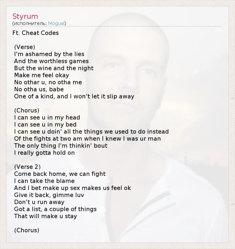 Ft. Cheat Codes (Verse) I'm ashamed by the lies And the worthless games But the wine and the night Make me feel okay No othar u, no otha me No otha us, babe One of a kind, and I won't let it slip away (Chorus) I can see u in my head I can see u in my bed I can see u doin' all the things we used to do instead Of the fights at two am when I knew I was ur man The only thing I'm thinkin' bout I really gotta hold on (Verse 2) Come back home, we can fight I can take the blame And I bet make up sex makes us feel ok Give it back, gimme luv Don't u run away Got a list, a couple of things That will make u stay (Chorus)