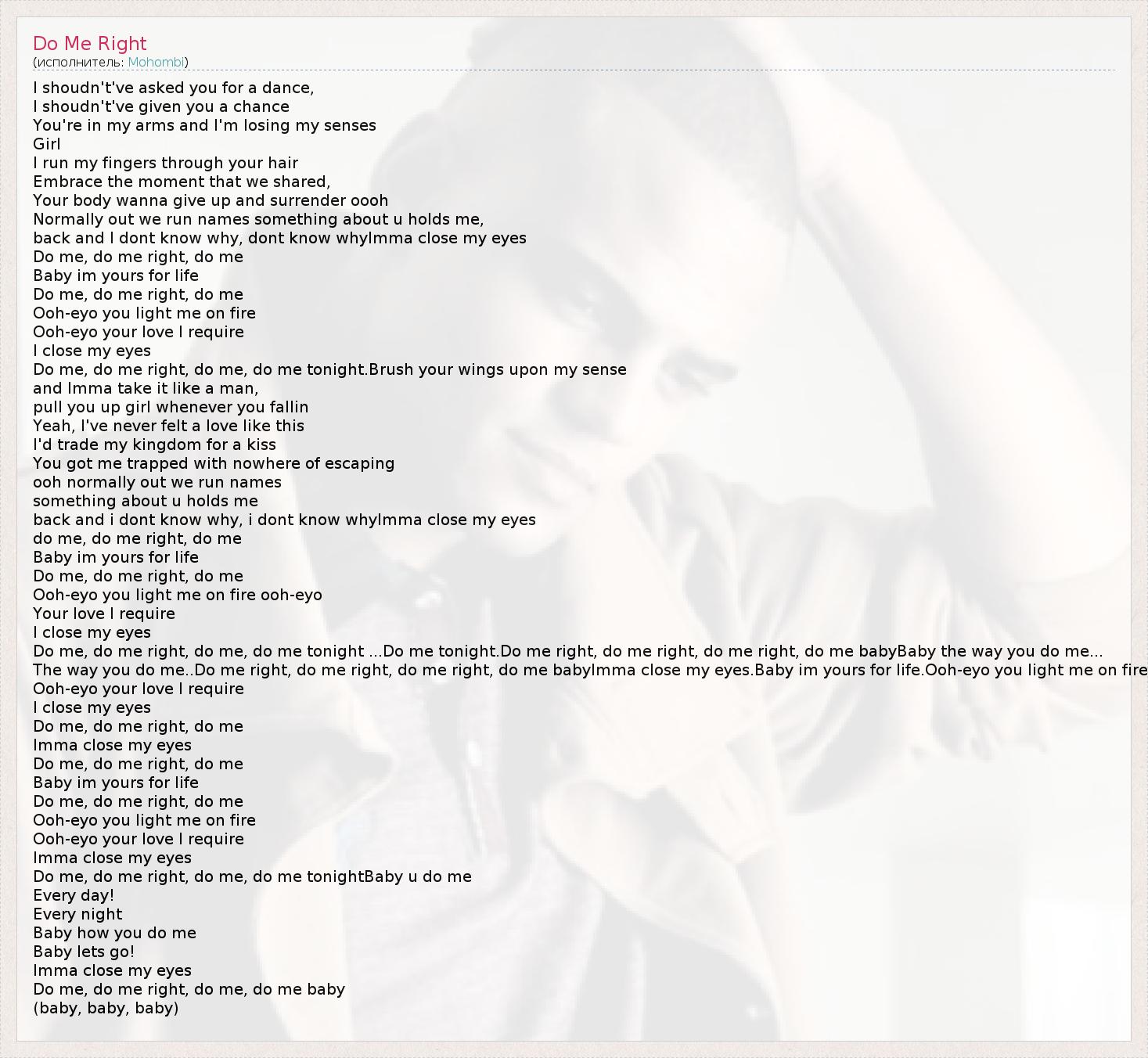I shoudn't've asked you for a dance, I shoudn't've given you a chance You're in my arms and I'm losing my senses Girl I run my fingers through your hair Embrace the moment that we shared, Your body wanna give up and surrender oooh Normally out we run names something about u holds me, back and I dont know why, dont know whyImma close my eyes Do me, do me right, do me Baby im yours for life Do me, do me right, do me Ooh-eyo you light me on fire Ooh-eyo your love I require I close my eyes Do me, do me right, do me, do me tonight.Brush your wings upon my sense and Imma take it like a man, pull you up girl whenever you fallin Yeah, I've never felt a love like this I'd trade my kingdom for a kiss You got me trapped with nowhere of escaping ooh normally out we run names something about u holds me back and i dont know why, i dont know whyImma close my eyes do me, do me right, do me Baby im yours for life Do me, do me right, do me Ooh-eyo you light me on fire ooh-eyo Your love I require I close my eyes Do me, do me right, do me, do me tonight ...Do me tonight.Do me right, do me right, do me right, do me babyBaby the way you do me... The way you do me..Do me right, do me right, do me right, do me babyImma close my eyes.Baby im yours for life.Ooh-eyo you light me on fire Ooh-eyo your love I require I close my eyes Do me, do me right, do me Imma close my eyes Do me, do me right, do me Baby im yours for life Do me, do me right, do me Ooh-eyo you light me on fire Ooh-eyo your love I require Imma close my eyes Do me, do me right, do me, do me tonightBaby u do me Every day! Every night Baby how you do me Baby lets go! Imma close my eyes Do me, do me right, do me, do me baby (baby, baby, baby)