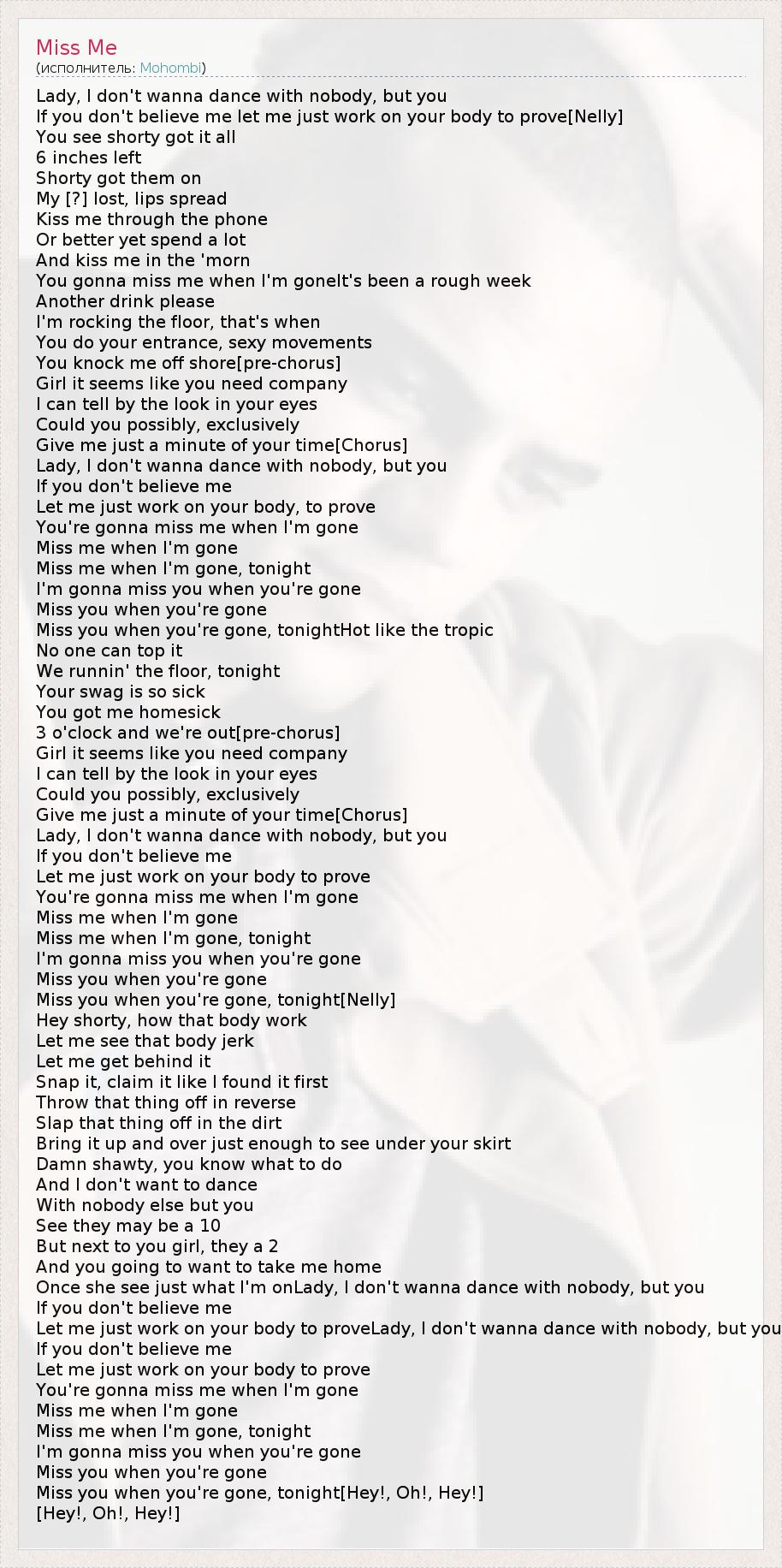 Lady, I don't wanna dance with nobody, but you If you don't believe me let me just work on your body to prove[Nelly] You see shorty got it all 6 inches left Shorty got them on My [?] lost, lips spread Kiss me through the phone Or better yet spend a lot And kiss me in the 'morn You gonna miss me when I'm goneIt's been a rough week Another drink please I'm rocking the floor, that's when You do your entrance, sexy movements You knock me off shore[pre-chorus] Girl it seems like you need company I can tell by the look in your eyes Could you possibly, exclusively Give me just a minute of your time[Chorus] Lady, I don't wanna dance with nobody, but you If you don't believe me Let me just work on your body, to prove You're gonna miss me when I'm gone Miss me when I'm gone Miss me when I'm gone, tonight I'm gonna miss you when you're gone Miss you when you're gone Miss you when you're gone, tonightHot like the tropic No one can top it We runnin' the floor, tonight Your swag is so sick You got me homesick 3 o'clock and we're out[pre-chorus] Girl it seems like you need company I can tell by the look in your eyes Could you possibly, exclusively Give me just a minute of your time[Chorus] Lady, I don't wanna dance with nobody, but you If you don't believe me Let me just work on your body to prove You're gonna miss me when I'm gone Miss me when I'm gone Miss me when I'm gone, tonight I'm gonna miss you when you're gone Miss you when you're gone Miss you when you're gone, tonight[Nelly] Hey shorty, how that body work Let me see that body jerk Let me get behind it Snap it, claim it like I found it first Throw that thing off in reverse Slap that thing off in the dirt Bring it up and over just enough to see under your skirt Damn shawty, you know what to do And I don't want to dance With nobody else but you See they may be a 10 But next to you girl, they a 2 And you going to want to take me home Once she see just what I'm onLady, I don't wanna dance with nobody, but you If you don't believe me Let me just work on your body to proveLady, I don't wanna dance with nobody, but you If you don't believe me Let me just work on your body to prove You're gonna miss me when I'm gone Miss me when I'm gone Miss me when I'm gone, tonight I'm gonna miss you when you're gone Miss you when you're gone Miss you when you're gone, tonight[Hey!, Oh!, Hey!] [Hey!, Oh!, Hey!]