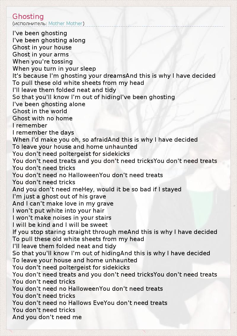 I've been ghosting I've been ghosting along Ghost in your house Ghost in your arms When you're tossing When you turn in your sleep It's because I'm ghosting your dreamsAnd this is why I have decided To pull these old white sheets from my head I'll leave them folded neat and tidy So that you'll know I'm out of hidingI've been ghosting I've been ghosting alone Ghost in the world Ghost with no home I remember I remember the days When I'd make you oh, so afraidAnd this is why I have decided To leave your house and home unhaunted You don't need poltergeist for sidekicks You don't need treats and you don't need tricksYou don't need treats You don't need tricks You don't need no HalloweenYou don't need treats You don't need tricks And you don't need meHey, would it be so bad if I stayed I'm just a ghost out of his grave And I can't make love in my grave I won't put white into your hair I won't make noises in your stairs I will be kind and I will be sweet If you stop staring straight through meAnd this is why I have decided To pull these old white sheets from my head I'll leave them folded neat and tidy So that you'll know I'm out of hidingAnd this is why I have decided To leave your house and home unhaunted You don't need poltergeist for sidekicks You don't need treats and you don't need tricksYou don't need treats You don't need tricks You don't need no HalloweenYou don't need treats You don't need tricks You don't need no Hallows EveYou don't need treats You don't need tricks And you don't need me