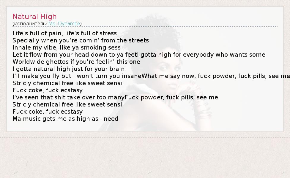 Life's full of pain, life's full of stress Specially when you're comin' from the streets Inhale my vibe, like ya smoking sess Let it flow from your head down to ya feetI gotta high for everybody who wants some Worldwide ghettos if you're feelin' this one I gotta natural high just for your brain I'll make you fly but I won't turn you insaneWhat me say now, fuck powder, fuck pills, see me Stricly chemical free like sweet sensi Fuck coke, fuck ecstasy I've seen that shit take over too manyFuck powder, fuck pills, see me Stricly chemical free like sweet sensi Fuck coke, fuck ecstasy Ma music gets me as high as I need