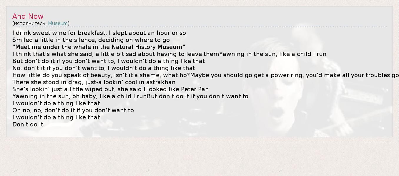 Это интересно:Museum - немецкая группа, играющая альтернатив-рок. Свои первые записи стали выпускать в 2010, а спустя два года официально дебютировали альбомом "Traces Of". В настоящее время работают над вторым альбомом.