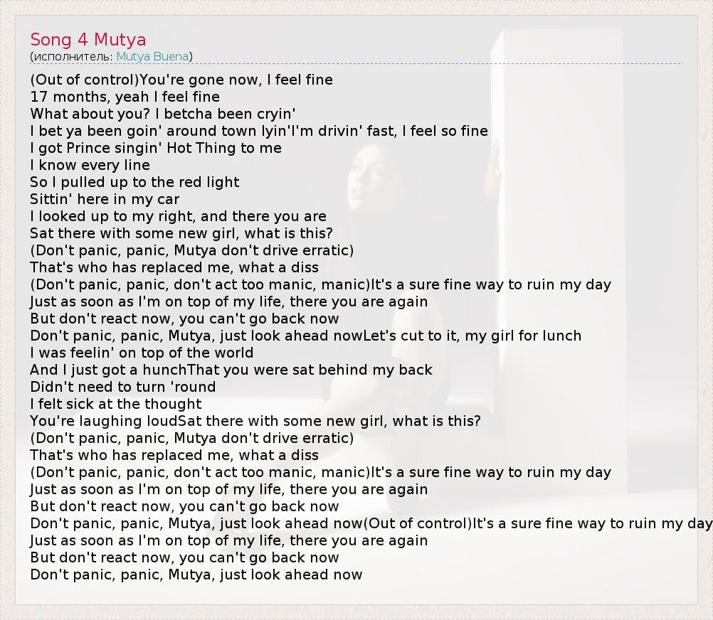 Don't panic, panic, Mutya, just look ahead now(Out of control)It's a sure fine way to ruin my day