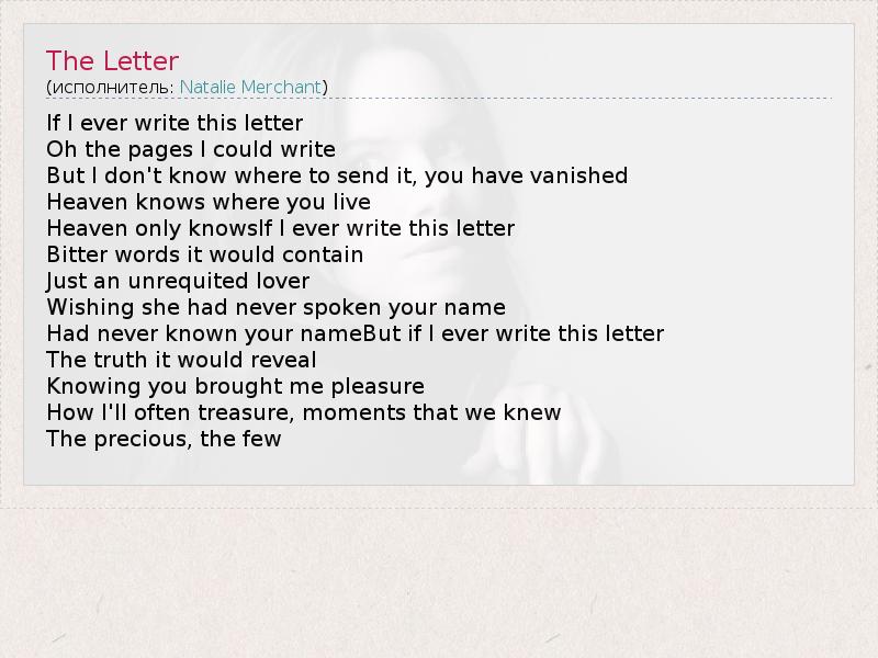 If I ever write this letter Oh the pages I could write But I don't know where to send it, you have vanished Heaven knows where you live Heaven only knowsIf I ever write this letter Bitter words it would contain Just an unrequited lover Wishing she had never spoken your name Had never known your nameBut if I ever write this letter The truth it would reveal Knowing you brought me pleasure How I'll often treasure, moments that we knew The precious, the few