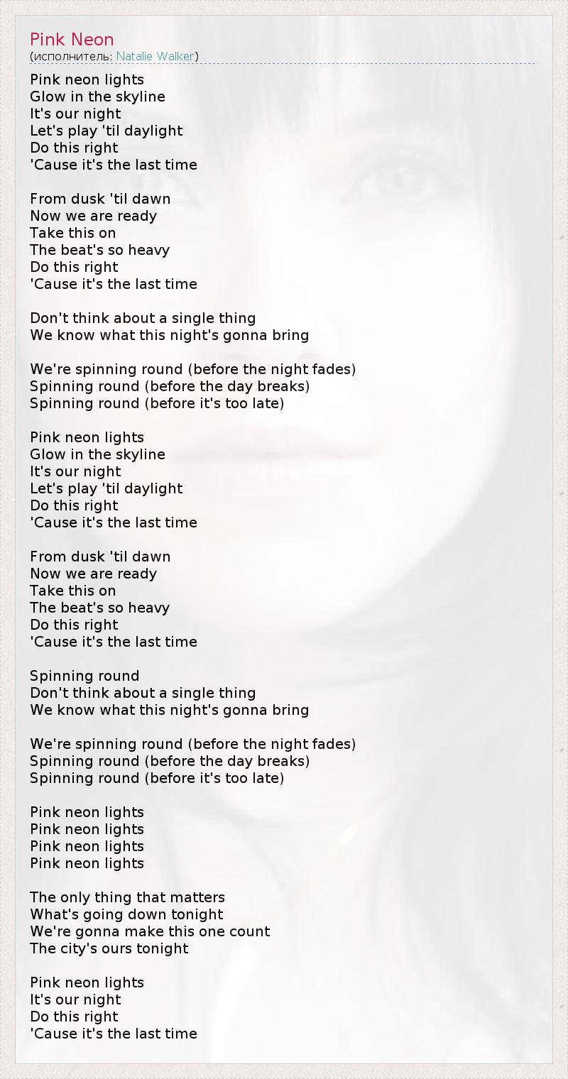 Pink neon lights Glow in the skyline It's our night Let's play 'til daylight Do this right 'Cause it's the last time From dusk 'til dawn Now we are ready Take this on The beat's so heavy Do this right 'Cause it's the last time Don't think about a single thing We know what this night's gonna bring We're spinning round (before the night fades) Spinning round (before the day breaks) Spinning round (before it's too late) Pink neon lights Glow in the skyline It's our night Let's play 'til daylight Do this right 'Cause it's the last time From dusk 'til dawn Now we are ready Take this on The beat's so heavy Do this right 'Cause it's the last time Spinning round Don't think about a single thing We know what this night's gonna bring We're spinning round (before the night fades) Spinning round (before the day breaks) Spinning round (before it's too late) Pink neon lights Pink neon lights Pink neon lights Pink neon lights The only thing that matters What's going down tonight We're gonna make this one count The city's ours tonight Pink neon lights It's our night Do this right 'Cause it's the last time