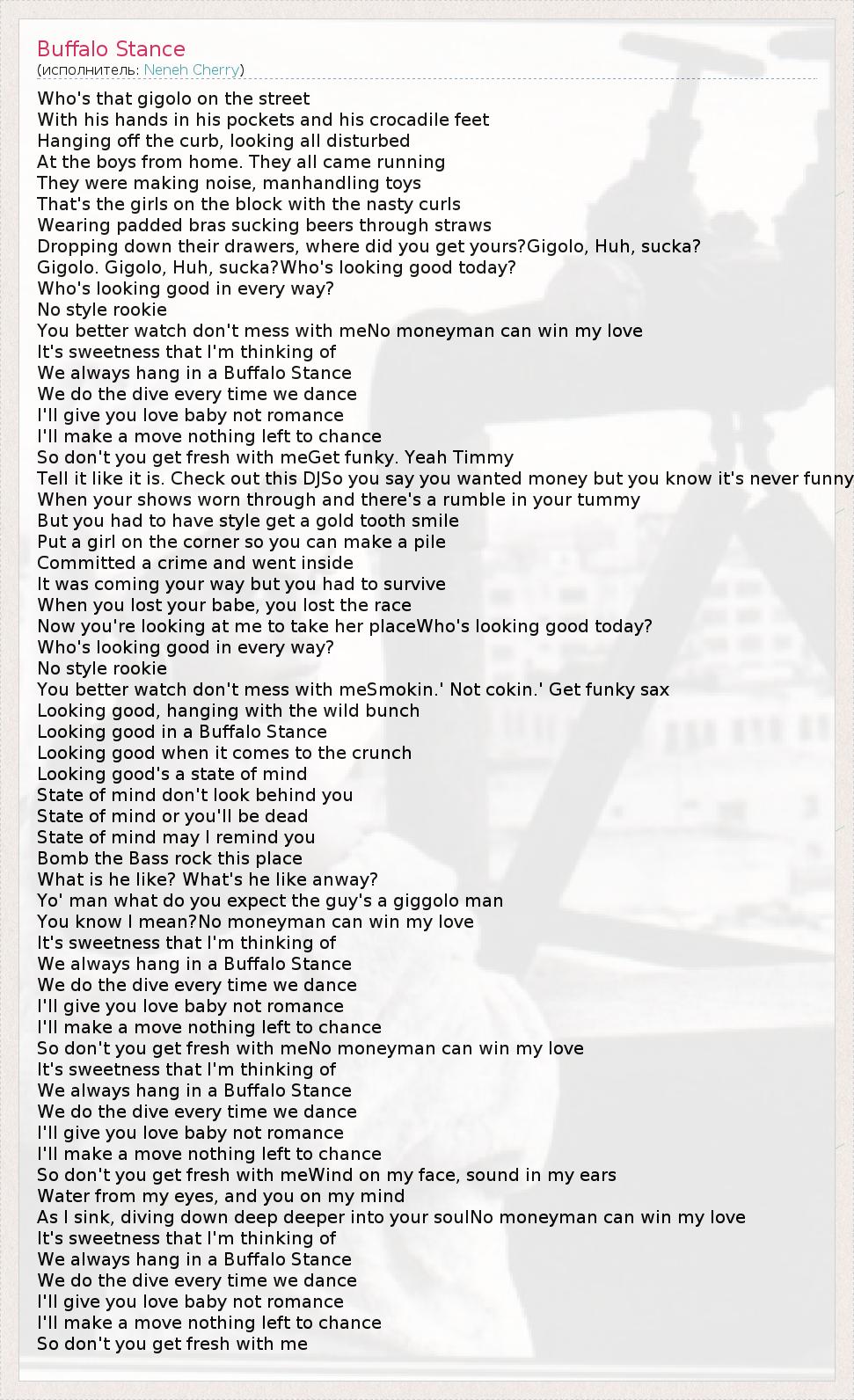 А как ты думаешь, о чем песня "Buffalo Stance" ?