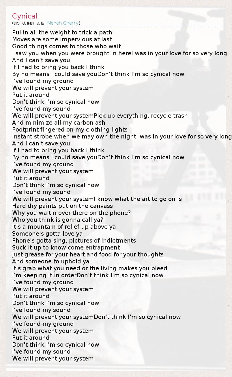 Это интересно:Певица Neneh Cherry (настоящее имя Neneh Mariann Karlsson) родилась 10 марта 1964 года в Стокгольме, Швеция. Является приемной дочерью джазового трубача Дона Черри (Don Cherry). В 1981 году Neneh Cherry становится вокалисткой английской постпанк-группы «Rip, Rig And Panic». В середине восьмидесятых также работала в группах «Slits» и «The The» в качестве бэк-вокалистки. В 1989 году Neneh Cherry записывает серию танцевальных... продолжение