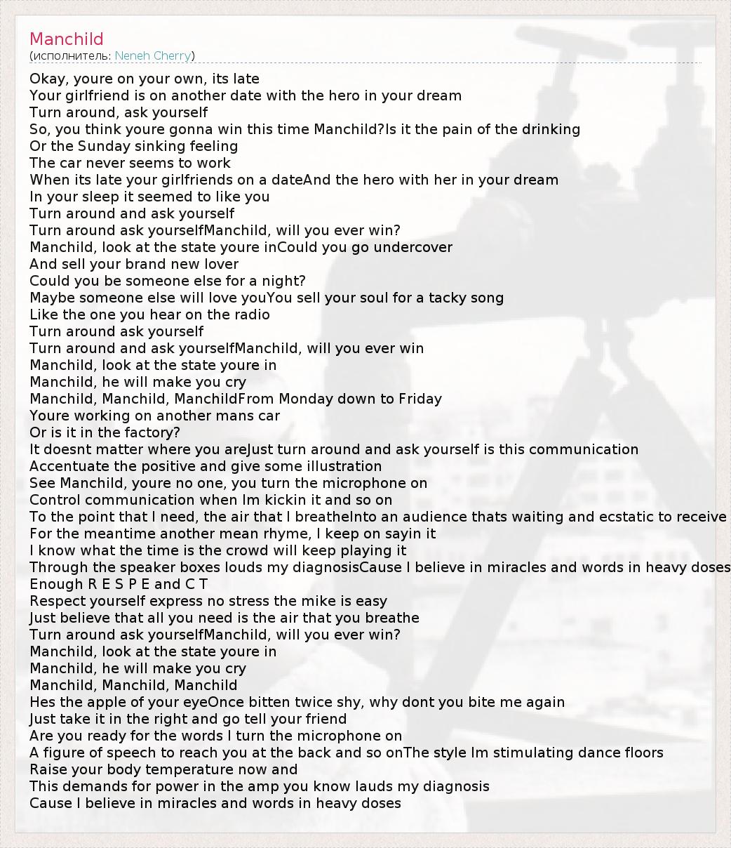 Это интересно:Певица Neneh Cherry (настоящее имя Neneh Mariann Karlsson) родилась 10 марта 1964 года в Стокгольме, Швеция. Является приемной дочерью джазового трубача Дона Черри (Don Cherry). В 1981 году Neneh Cherry становится вокалисткой английской постпанк-группы «Rip, Rig And Panic». В середине восьмидесятых также работала в группах «Slits» и «The The» в качестве бэк-вокалистки. В 1989 году Neneh Cherry записывает серию танцевальных... продолжение