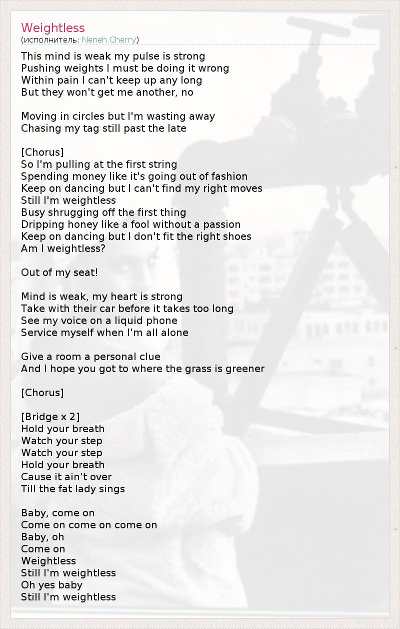 This mind is weak my pulse is strong Pushing weights I must be doing it wrong Within pain I can't keep up any long But they won't get me another, no Moving in circles but I'm wasting away Chasing my tag still past the late [Chorus] So I'm pulling at the first string Spending money like it's going out of fashion Keep on dancing but I can't find my right moves Still I'm weightless Busy shrugging off the first thing Dripping honey like a fool without a passion Keep on dancing but I don't fit the right shoes Am I weightless? Out of my seat! Mind is weak, my heart is strong Take with their car before it takes too long See my voice on a liquid phone Service myself when I'm all alone Give a room a personal clue And I hope you got to where the grass is greener [Chorus] [Bridge x 2] Hold your breath Watch your step Watch your step Hold your breath Cause it ain't over Till the fat lady sings Baby, come on Come on come on come on Baby, oh Come on Weightless Still I'm weightless Oh yes baby Still I'm weightless