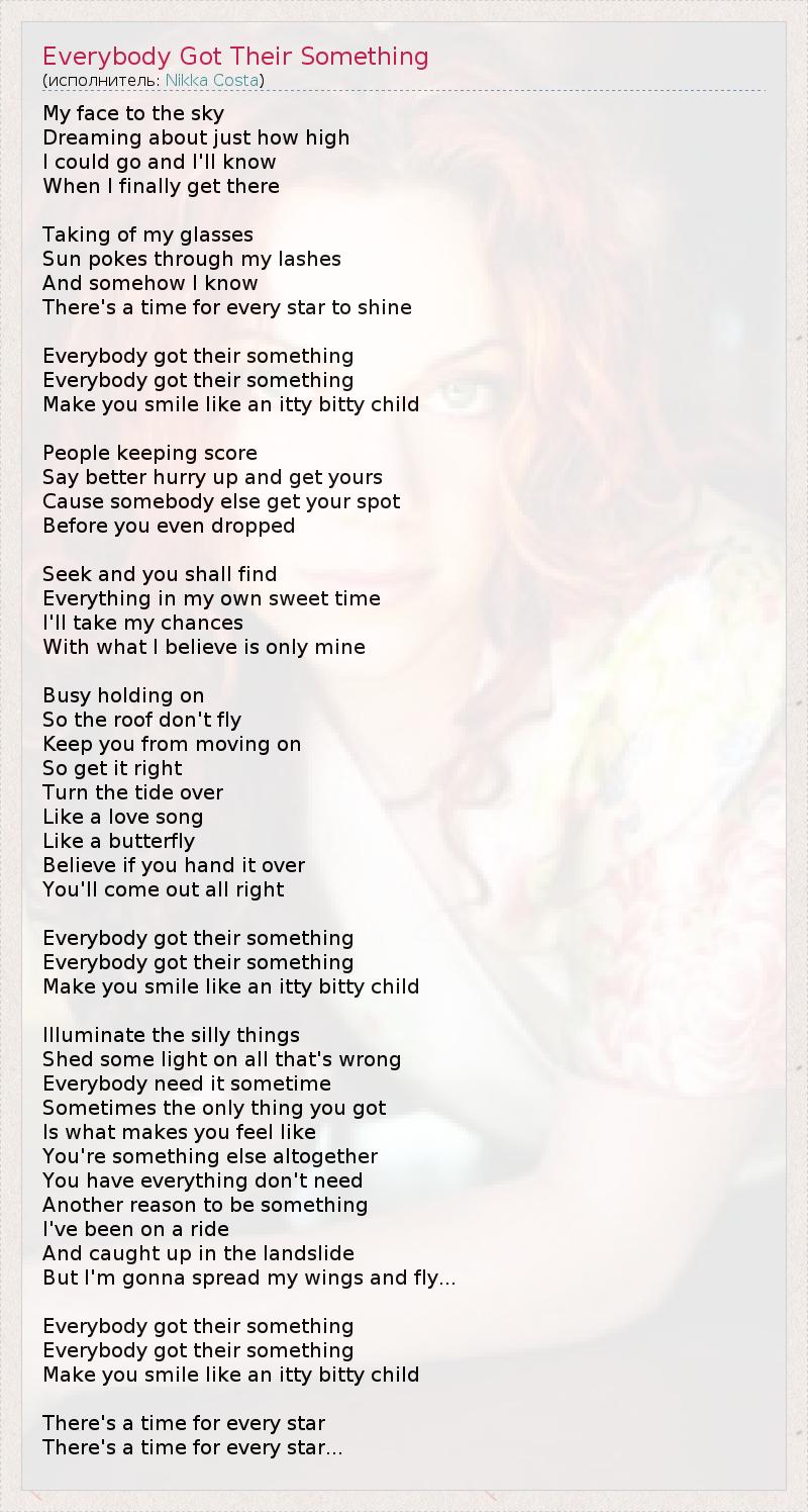 My face to the sky Dreaming about just how high I could go and I'll know When I finally get there Taking of my glasses Sun pokes through my lashes And somehow I know There's a time for every star to shine Everybody got their something Everybody got their something Make you smile like an itty bitty child People keeping score Say better hurry up and get yours Cause somebody else get your spot Before you even dropped Seek and you shall find Everything in my own sweet time I'll take my chances With what I believe is only mine Busy holding on So the roof don't fly Keep you from moving on So get it right Turn the tide over Like a love song Like a butterfly Believe if you hand it over You'll come out all right Everybody got their something Everybody got their something Make you smile like an itty bitty child Illuminate the silly things Shed some light on all that's wrong Everybody need it sometime Sometimes the only thing you got Is what makes you feel like You're something else altogether You have everything don't need Another reason to be something I've been on a ride And caught up in the landslide But I'm gonna spread my wings and fly... Everybody got their something Everybody got their something Make you smile like an itty bitty child There's a time for every star There's a time for every star...