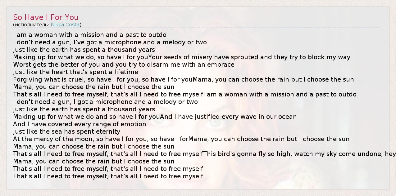 That's all I need to free myself, that's all I need to free myselfI am a woman with a mission and a past to outdo
