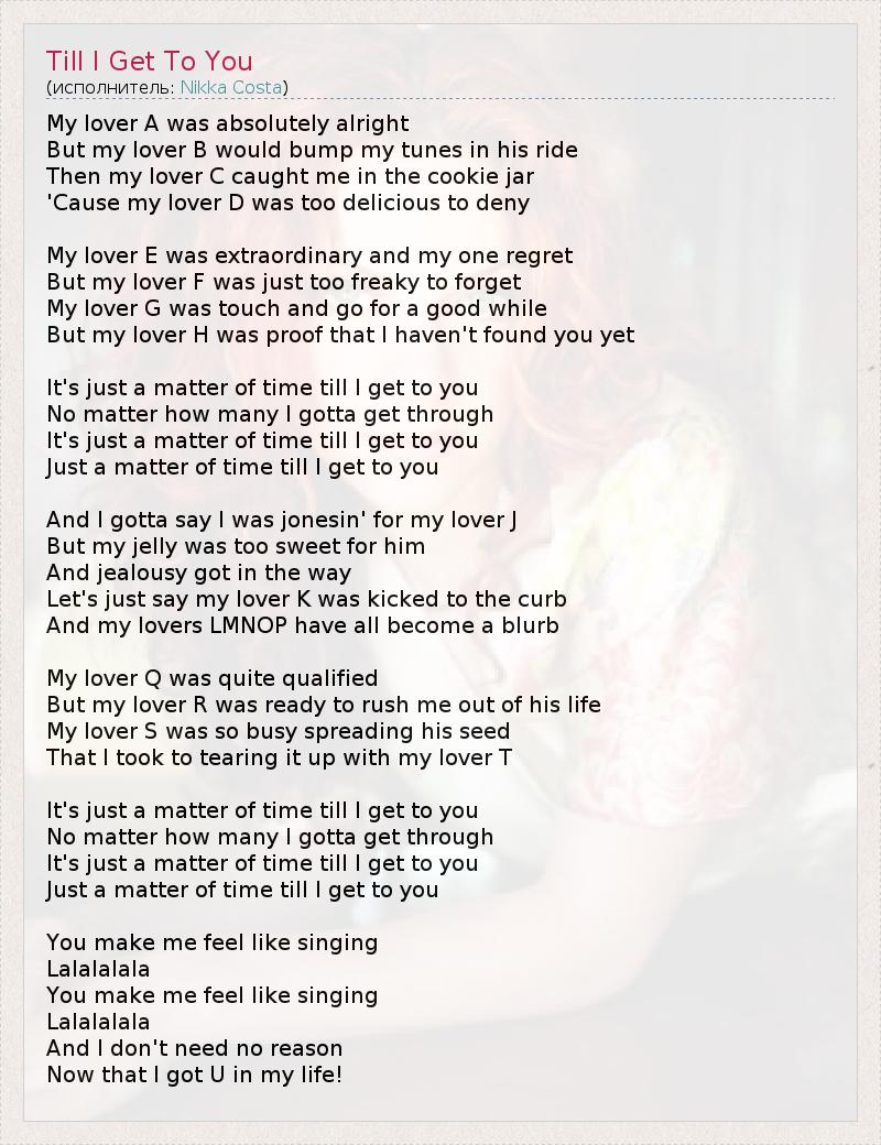 My lover A was absolutely alright But my lover B would bump my tunes in his ride Then my lover C caught me in the cookie jar 'Cause my lover D was too delicious to deny My lover E was extraordinary and my one regret But my lover F was just too freaky to forget My lover G was touch and go for a good while But my lover H was proof that I haven't found you yet It's just a matter of time till I get to you No matter how many I gotta get through It's just a matter of time till I get to you Just a matter of time till I get to you And I gotta say I was jonesin' for my lover J But my jelly was too sweet for him And jealousy got in the way Let's just say my lover K was kicked to the curb And my lovers LMNOP have all become a blurb My lover Q was quite qualified But my lover R was ready to rush me out of his life My lover S was so busy spreading his seed That I took to tearing it up with my lover T It's just a matter of time till I get to you No matter how many I gotta get through It's just a matter of time till I get to you Just a matter of time till I get to you You make me feel like singing Lalalalala You make me feel like singing Lalalalala And I don't need no reason Now that I got U in my life!