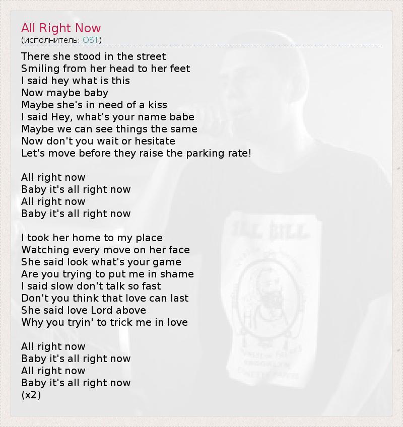 There she stood in the street Smiling from her head to her feet I said hey what is this Now maybe baby Maybe she's in need of a kiss I said Hey, what's your name babe Maybe we can see things the same Now don't you wait or hesitate Let's move before they raise the parking rate! All right now Baby it's all right now All right now Baby it's all right now I took her home to my place Watching every move on her face She said look what's your game Are you trying to put me in shame I said slow don't talk so fast Don't you think that love can last She said love Lord above Why you tryin' to trick me in love All right now Baby it's all right now All right now Baby it's all right now (х2)