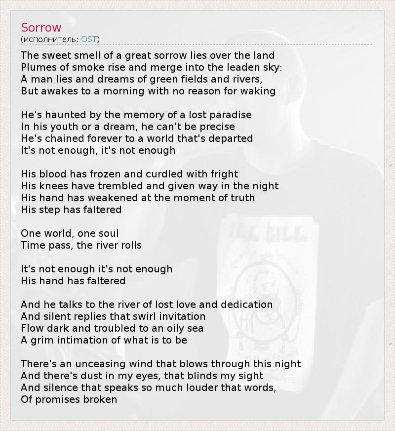 Печали запах лежит по земле, Дым вьётся ввысь, сливаясь со свинцом небес, Реки с полями человеку снятся, Но утром он проснётся без причины просыпаться. О потерянном рае скорбит его память, Где юность, где грёзы – не в силах представить, Прикован навечно к давно умершему миру; Ещё не всё, ещё не всё – Кровь в страхе застыла и сердце молчит, Колени, дрожа, подогнулись в ночи Руки ослабли, его шаги сбились Пред тяжестью Истин. Мир жив душой, Время течёт рекой… Ещё не всё, ещё не всё – Его руки ослабли... О любви и измене говорит он с рекою, Тихо в ответ та зовет его с собою Темным и бурным уносясь потоком в море И жёстким намеком – кончится всё. Нескончаемый ветер несется вдаль сквозь ночь, В моих глазах пыль, мне смотреть невмочь И звучит тишина оглушительней всех слов, Что не сдержаны были...