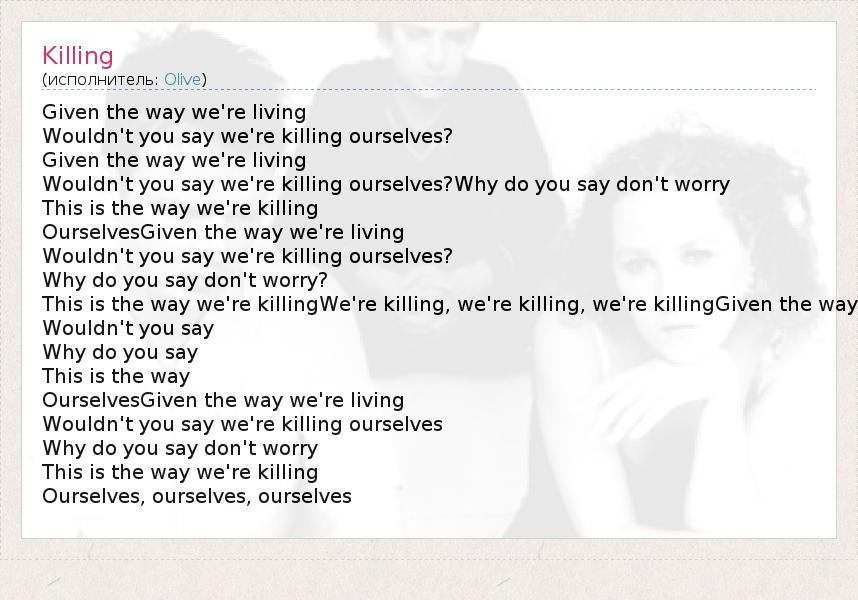 This is the way we're killingWe're killing, we're killing, we're killingGiven the way