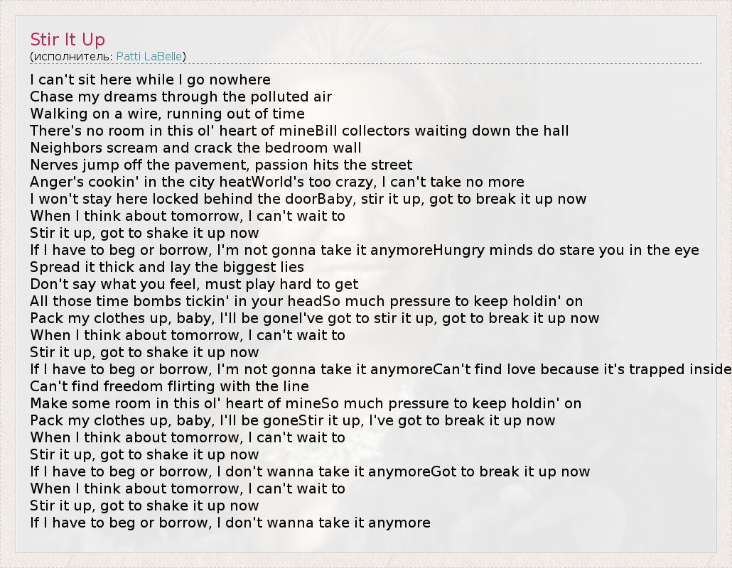 I can't sit here while I go nowhere Chase my dreams through the polluted air Walking on a wire, running out of time There's no room in this ol' heart of mineBill collectors waiting down the hall Neighbors scream and crack the bedroom wall Nerves jump off the pavement, passion hits the street Anger's cookin' in the city heatWorld's too crazy, I can't take no more I won't stay here locked behind the doorBaby, stir it up, got to break it up now When I think about tomorrow, I can't wait to Stir it up, got to shake it up now If I have to beg or borrow, I'm not gonna take it anymoreHungry minds do stare you in the eye Spread it thick and lay the biggest lies Don't say what you feel, must play hard to get All those time bombs tickin' in your headSo much pressure to keep holdin' on Pack my clothes up, baby, I'll be goneI've got to stir it up, got to break it up now When I think about tomorrow, I can't wait to Stir it up, got to shake it up now If I have to beg or borrow, I'm not gonna take it anymoreCan't find love because it's trapped inside Can't find freedom flirting with the line Make some room in this ol' heart of mineSo much pressure to keep holdin' on Pack my clothes up, baby, I'll be goneStir it up, I've got to break it up now When I think about tomorrow, I can't wait to Stir it up, got to shake it up now If I have to beg or borrow, I don't wanna take it anymoreGot to break it up now When I think about tomorrow, I can't wait to Stir it up, got to shake it up now If I have to beg or borrow, I don't wanna take it anymore