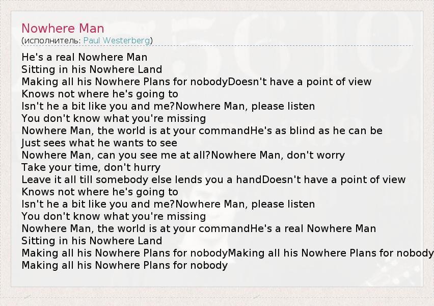 He's a real Nowhere Man Sitting in his Nowhere Land Making all his Nowhere Plans for nobodyDoesn't have a point of view Knows not where he's going to Isn't he a bit like you and me?Nowhere Man, please listen You don't know what you're missing Nowhere Man, the world is at your commandHe's as blind as he can be Just sees what he wants to see Nowhere Man, can you see me at all?Nowhere Man, don't worry Take your time, don't hurry Leave it all till somebody else lends you a handDoesn't have a point of view Knows not where he's going to Isn't he a bit like you and me?Nowhere Man, please listen You don't know what you're missing Nowhere Man, the world is at your commandHe's a real Nowhere Man Sitting in his Nowhere Land Making all his Nowhere Plans for nobodyMaking all his Nowhere Plans for nobody Making all his Nowhere Plans for nobody