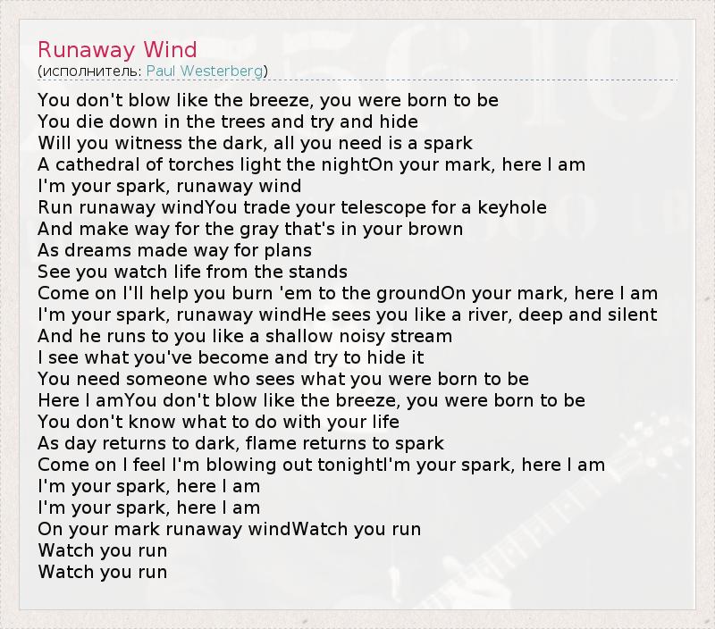 You don't blow like the breeze, you were born to be You die down in the trees and try and hide Will you witness the dark, all you need is a spark A cathedral of torches light the nightOn your mark, here I am I'm your spark, runaway wind Run runaway windYou trade your telescope for a keyhole And make way for the gray that's in your brown As dreams made way for plans See you watch life from the stands Come on I'll help you burn 'em to the groundOn your mark, here I am I'm your spark, runaway windHe sees you like a river, deep and silent And he runs to you like a shallow noisy stream I see what you've become and try to hide it You need someone who sees what you were born to be Here I amYou don't blow like the breeze, you were born to be You don't know what to do with your life As day returns to dark, flame returns to spark Come on I feel I'm blowing out tonightI'm your spark, here I am I'm your spark, here I am I'm your spark, here I am On your mark runaway windWatch you run Watch you run Watch you run