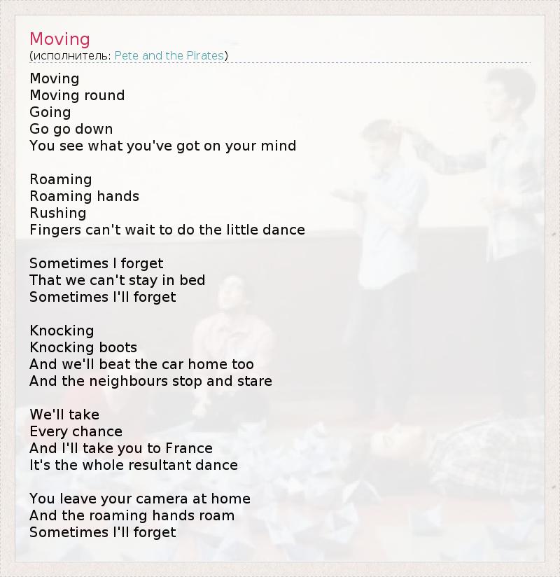 Moving Moving round Going Go go down You see what you've got on your mind Roaming Roaming hands Rushing Fingers can't wait to do the little dance Sometimes I forget That we can't stay in bed Sometimes I'll forget Knocking Knocking boots And we'll beat the car home too And the neighbours stop and stare We'll take Every chance And I'll take you to France It's the whole resultant dance You leave your camera at home And the roaming hands roam Sometimes I'll forget