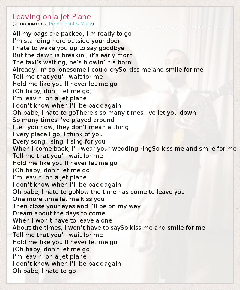 All my bags are packed, I'm ready to go I'm standing here outside your door I hate to wake you up to say goodbye But the dawn is breakin', it's early morn The taxi's waiting, he's blowin' his horn Already I'm so lonesome I could crySo kiss me and smile for me Tell me that you'll wait for me Hold me like you'll never let me go (Oh baby, don't let me go) I'm leavin' on a jet plane I don't know when I'll be back again Oh babe, I hate to goThere's so many times I've let you down So many times I've played around I tell you now, they don't mean a thing Every place I go, I think of you Every song I sing, I sing for you When I come back, I'll wear your wedding ringSo kiss me and smile for me Tell me that you'll wait for me Hold me like you'll never let me go (Oh baby, don't let me go) I'm leavin' on a jet plane I don't know when I'll be back again Oh babe, I hate to goNow the time has come to leave you One more time let me kiss you Then close your eyes and I'll be on my way Dream about the days to come When I won't have to leave alone About the times, I won't have to saySo kiss me and smile for me Tell me that you'll wait for me Hold me like you'll never let me go (Oh baby, don't let me go) I'm leavin' on a jet plane I don't know when I'll be back again Oh babe, I hate to go