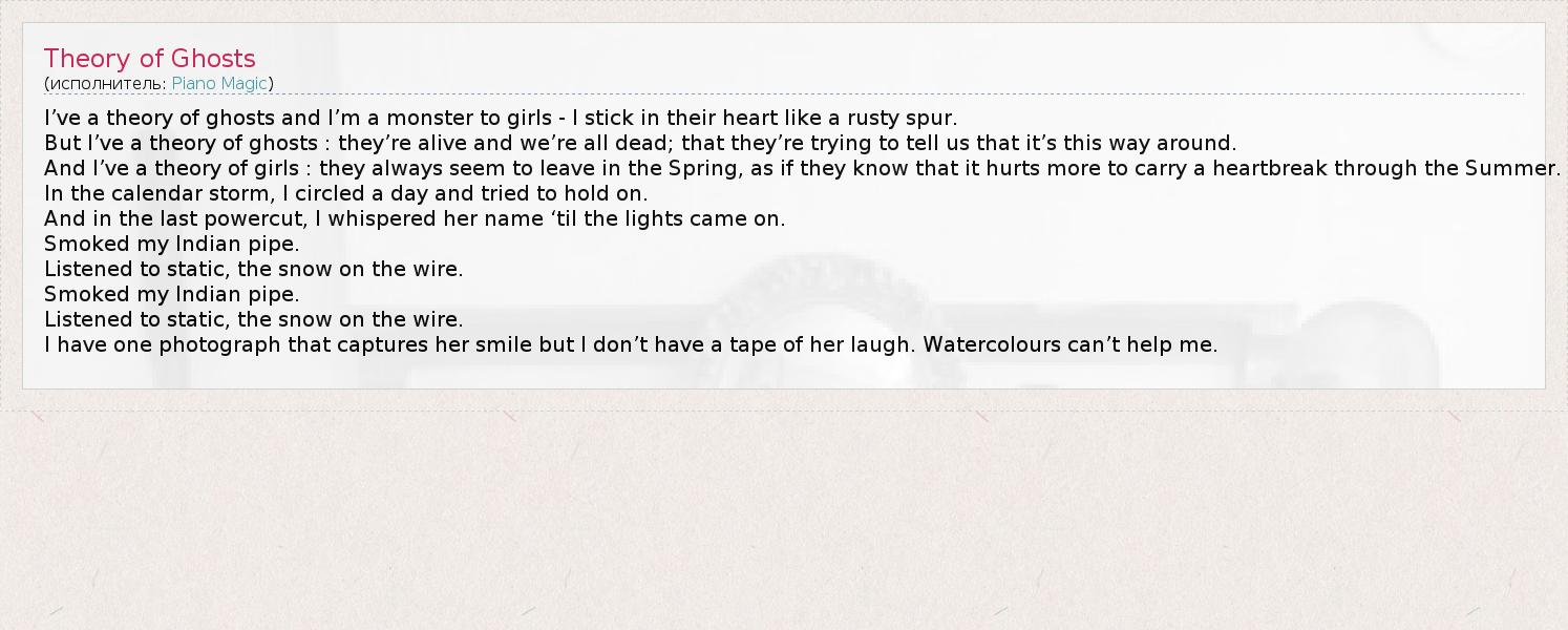 I’ve a theory of ghosts and I’m a monster to girls - I stick in their heart like a rusty spur. But I’ve a theory of ghosts : they’re alive and we’re all dead; that they’re trying to tell us that it’s this way around. And I’ve a theory of girls : they always seem to leave in the Spring, as if they know that it hurts more to carry a heartbreak through the Summer. In the calendar storm, I circled a day and tried to hold on. And in the last powercut, I whispered her name ‘til the lights came on. Smoked my Indian pipe. Listened to static, the snow on the wire. Smoked my Indian pipe. Listened to static, the snow on the wire. I have one photograph that captures her smile but I don’t have a tape of her laugh. Watercolours can’t help me.